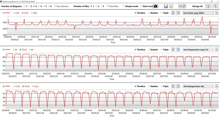 Tijdens de stresstest vlakt de processor af op 35-39 watt na een korte piek van 90 watt, terwijl de grafische kaart stabiel blijft op 40 watt. Na de stresstest worden de prestaties niet minder. Bij accugebruik dalen de waarden licht, waarbij de CPU nog steeds 25 watt en de GPU 30 watt mag verbruiken onder gecombineerde belasting.