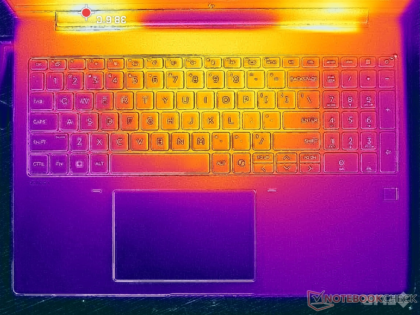 De oppervlaktetemperaturen zijn over het algemeen koeler op onze nieuwe 16-inch vormfactor, vooral met betrekking tot de onderkant. Hete plekken aan de onderkant bereiken slechts 41 C bij zware belasting, vergeleken met 48 C op de oudere ZBook Power 15 G10. De hotspot op het toetsenbord in het midden bereikt ook 41 C, terwijl de palmsteunen en zijkanten koeler en comfortabeler blijven voor handpalmen en vingers.