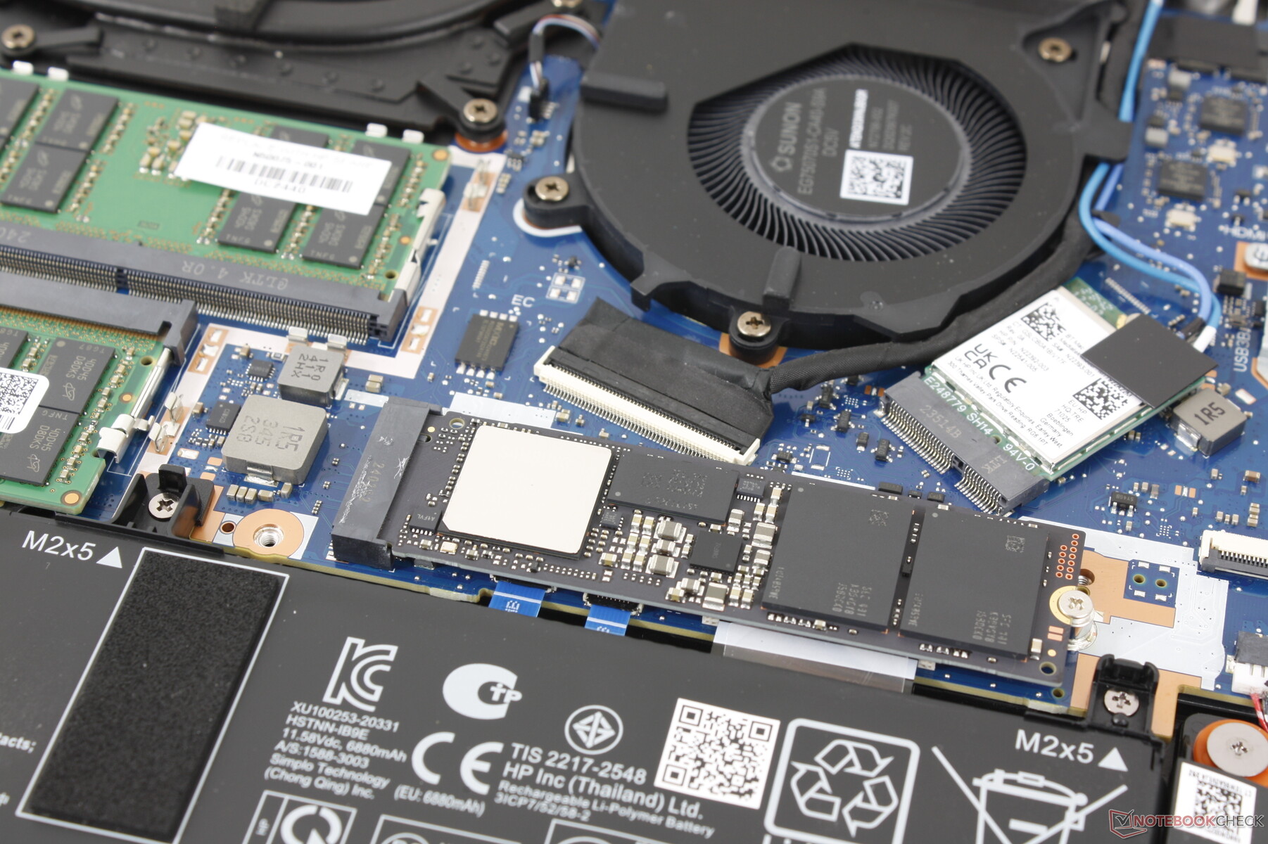 Het onderste paneel springt er relatief gemakkelijk af met slechts een kruiskopschroevendraaier en een scherpe rand. De interne onderdelen zijn volledig opnieuw ontworpen in vergelijking met de ZBook Power 15 G10, maar met behoud van dezelfde opwaardeerbare opties zoals de 2x SODIMM-sleuven, 2x PCIe4 x4 NVMe SSD-sleuven en verwijderbare WLAN-module. WAN is deze keer een extra optie.