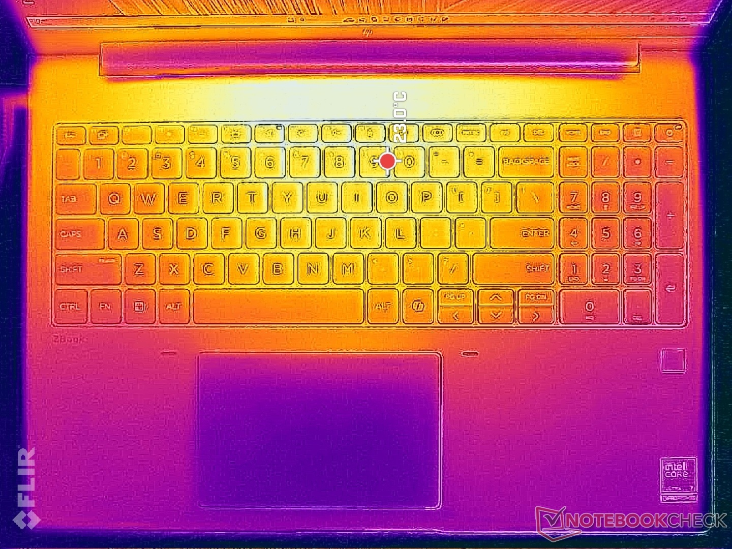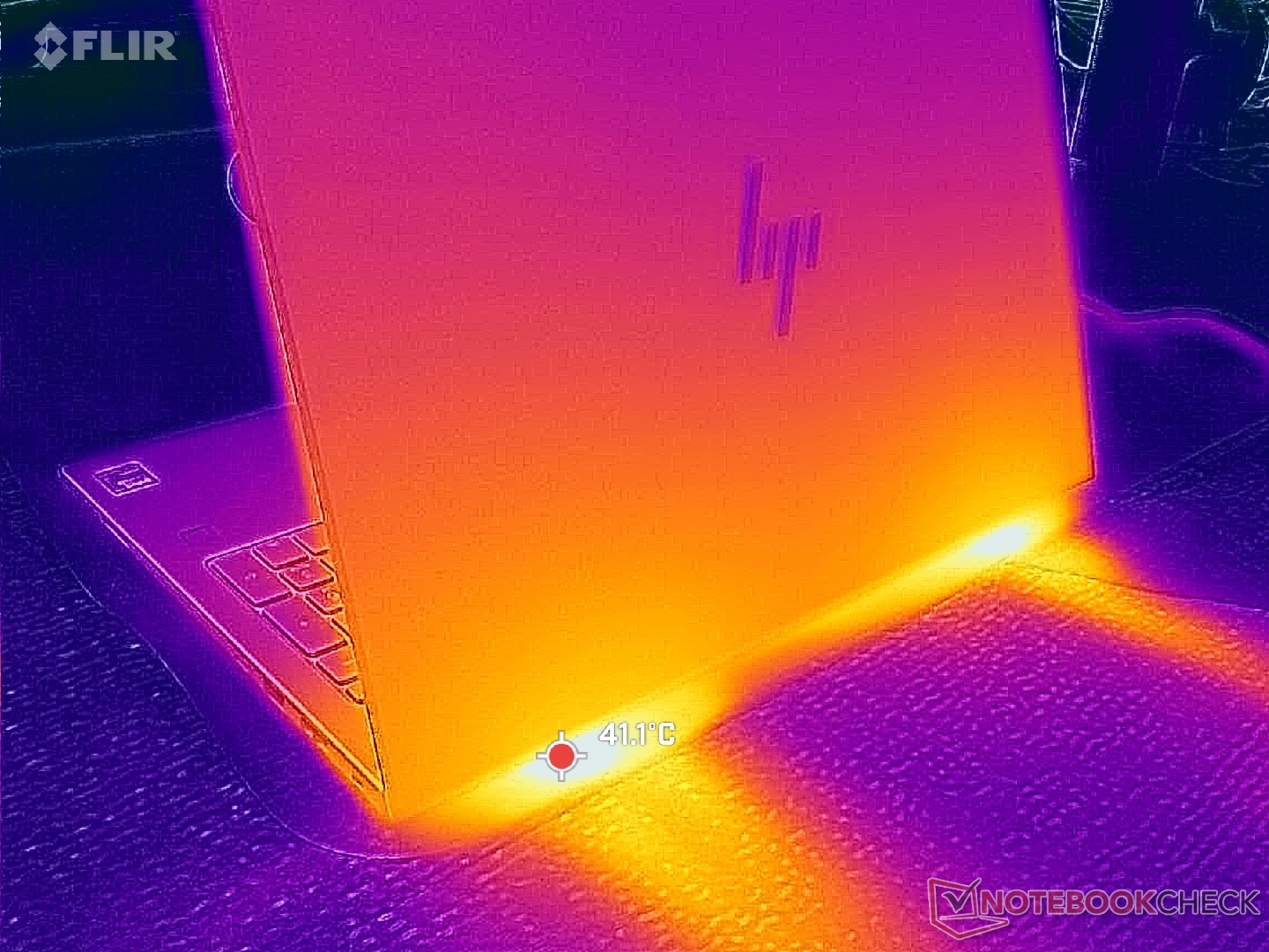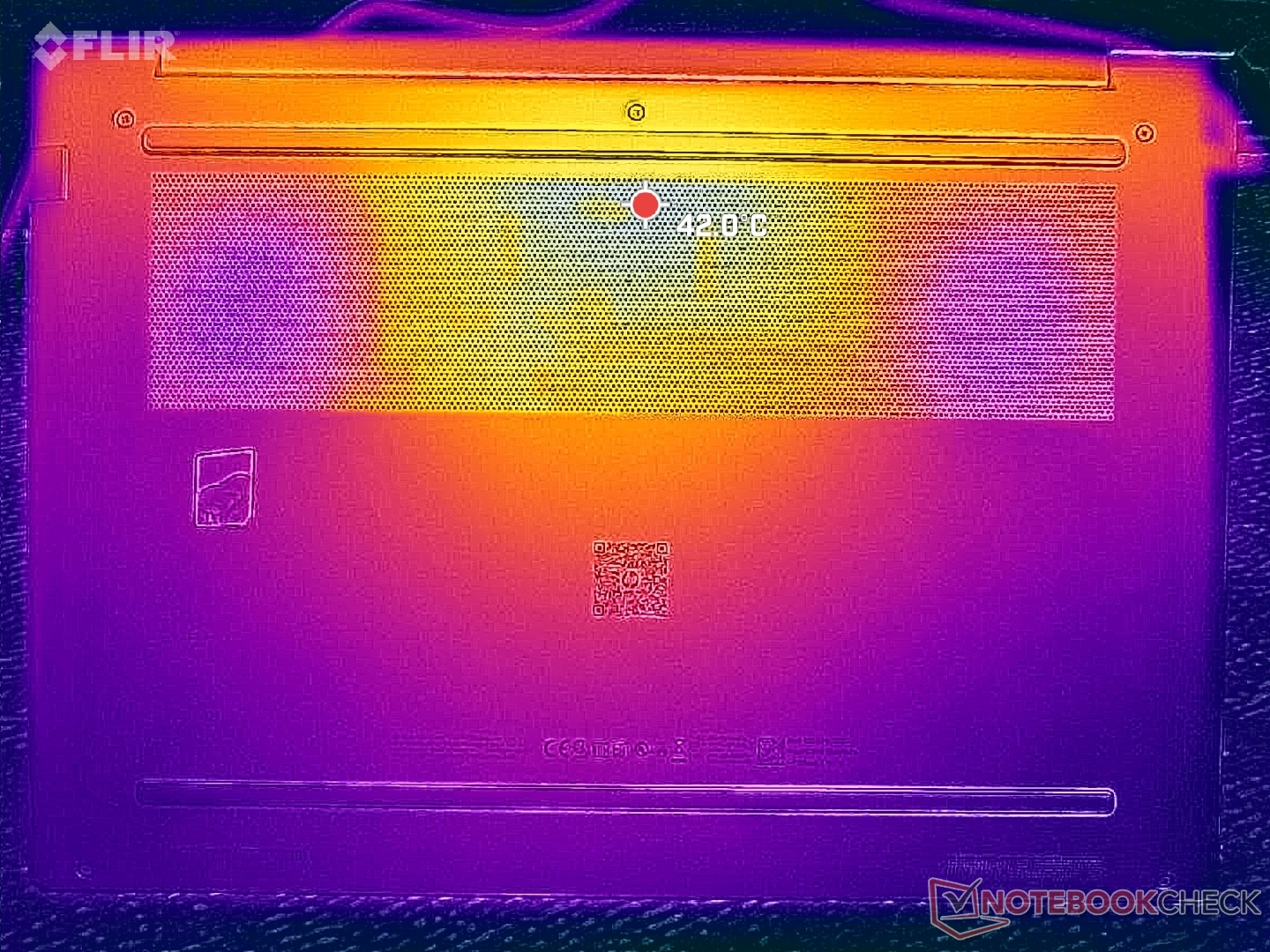 De ontwikkeling van de oppervlaktetemperatuur is het warmst in het midden, waar deze meer dan 36 C kan bereiken bij zware belasting, wat beduidend koeler is dan wat we hebben gemeten op de ThinkPad P16 Gen 2 of Dell Precision 5690.