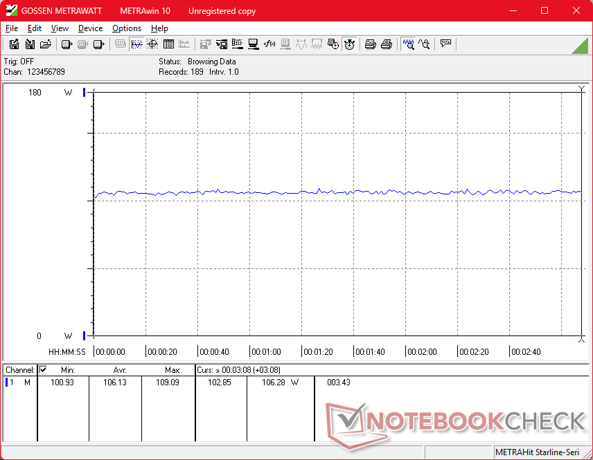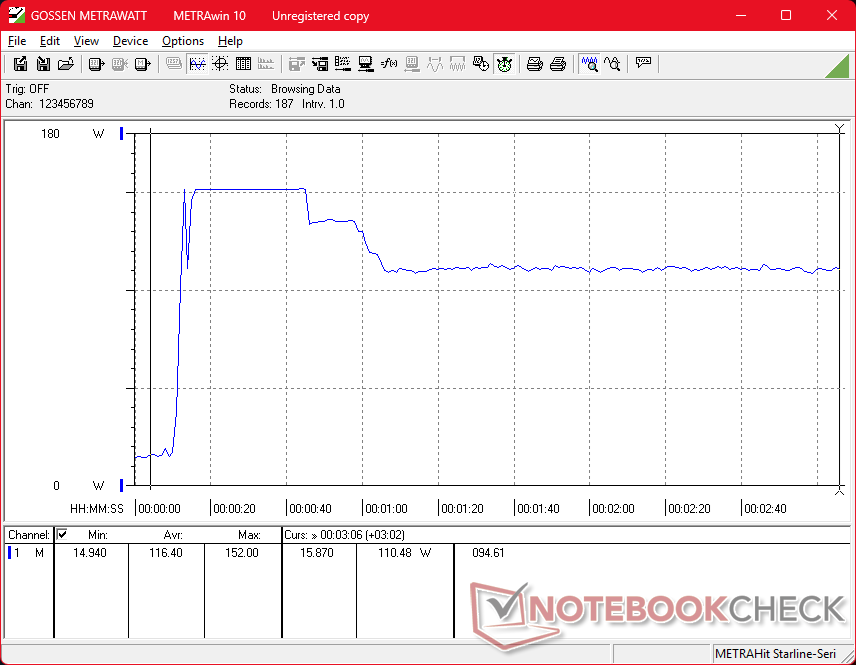 We kunnen een tijdelijke maximale stroomafname van 153 W meten uit de kleine (~13,8 x 6,5 x 2,2 cm) 150 W wisselstroomadapter wanneer de CPU en GPU volledig belast worden.