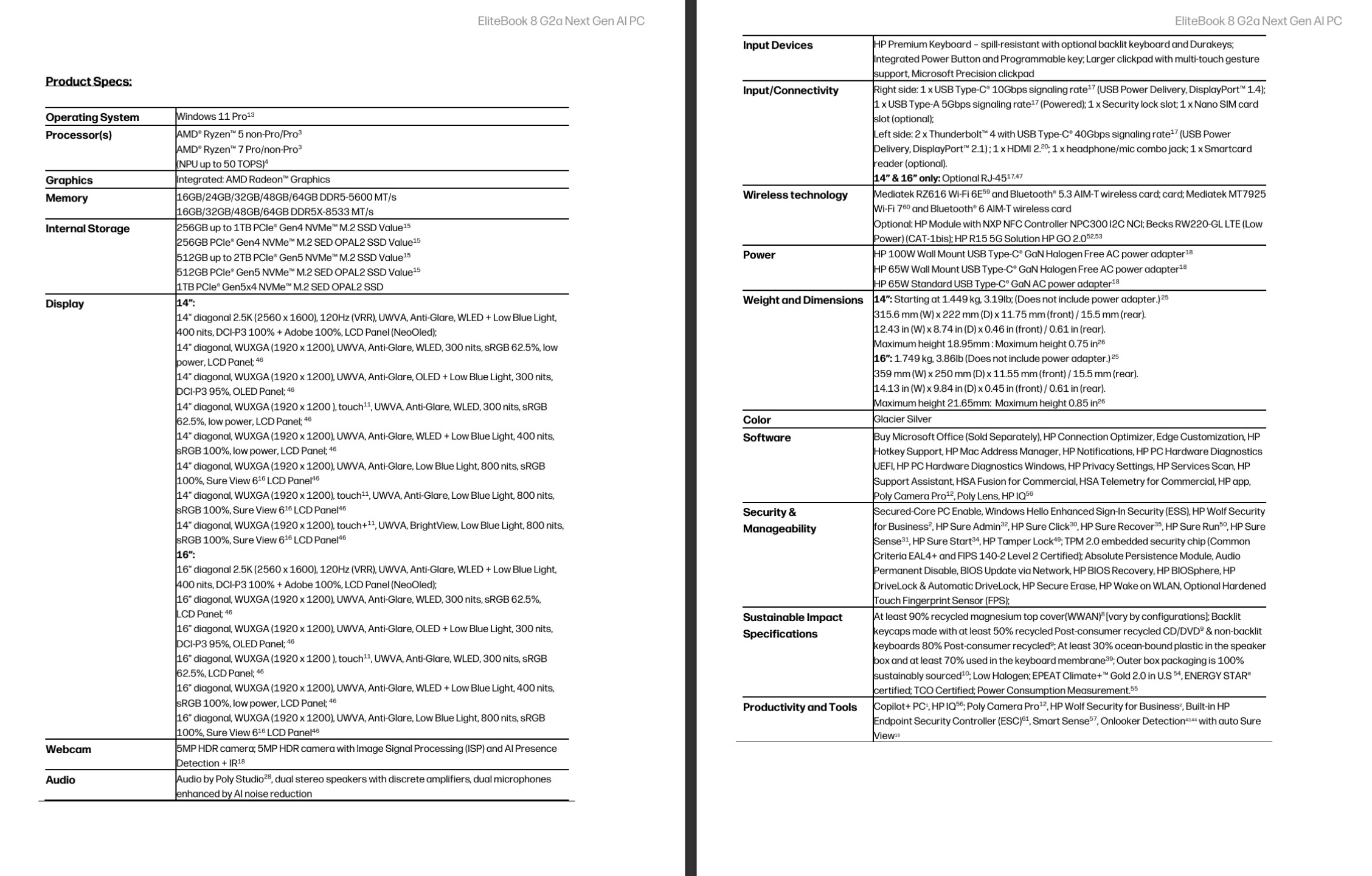 Voorlopig is HP nogal terughoudend over welke processors er in de EliteBook 8 G2a en EliteBook 8 G2i zitten. Voor zover we kunnen nagaan, gebruikt de eerste het Gorgon Point-platform van AMD met minimale prestatie- of efficiëntieverbeteringen ten opzichte van Strix Point. Daarentegen zou de EliteBook 8 G2i Panther Lake-processoren moeten gebruiken, waarbij HP niet nader gedefinieerde Core Ultra 5- en Core Ultra 7 SKU's noemt.