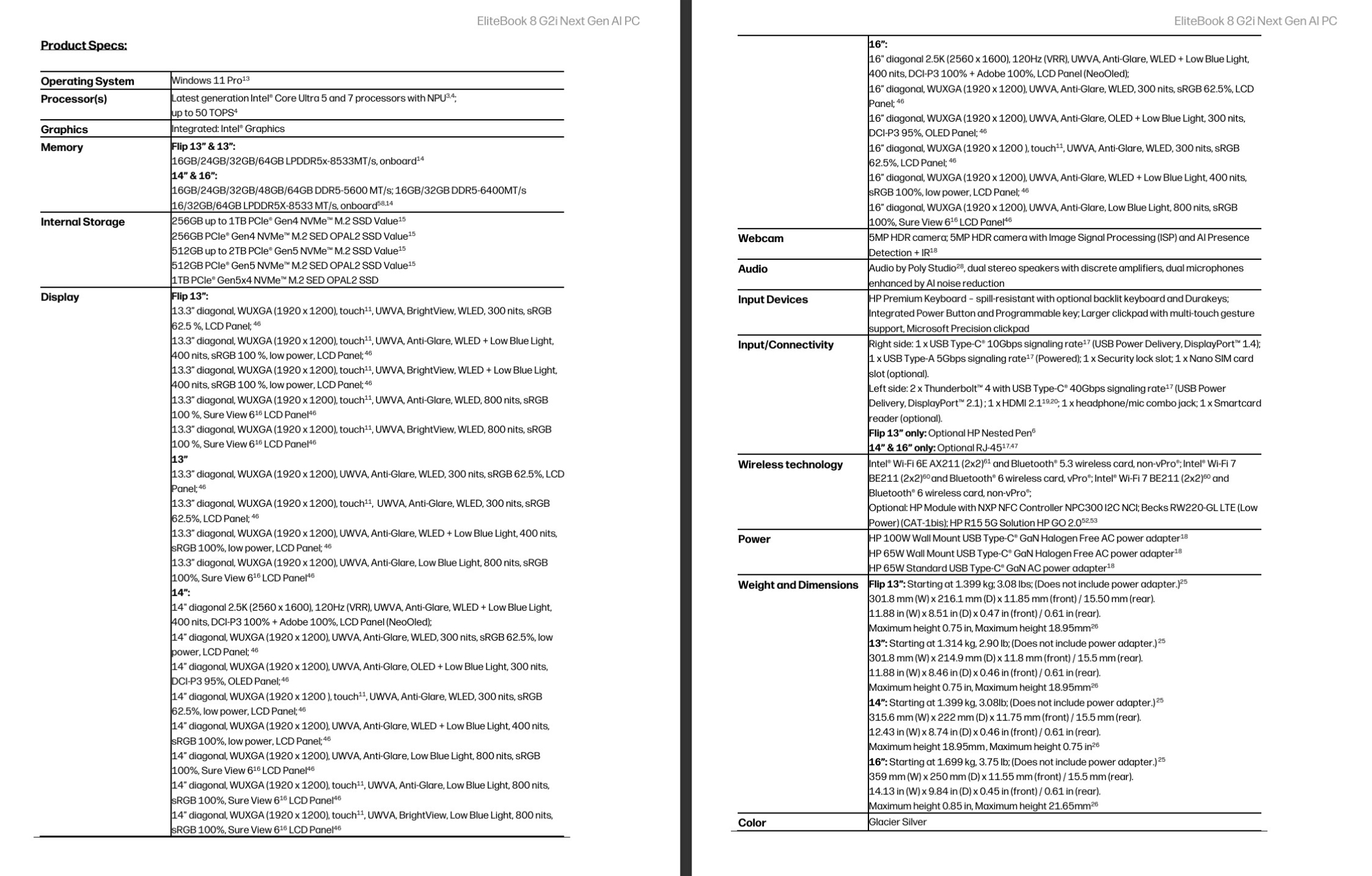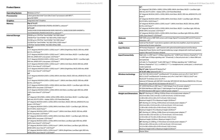 Alle varianten zullen configureerbaar zijn met meerdere panelen tot 2,5K en 120 Hz VRR-opties voor alle 14-inch en 16-inch varianten. HP heeft bevestigd dat er bij de lancering ook IPS- en OLED-panelen beschikbaar zullen zijn. Andere verschillen zijn gesoldeerd LPDD5X-8533 RAM voor sommige SKU's en door de gebruiker te upgraden DDR5-5600 of DDR5-6400 RAM voor andere.