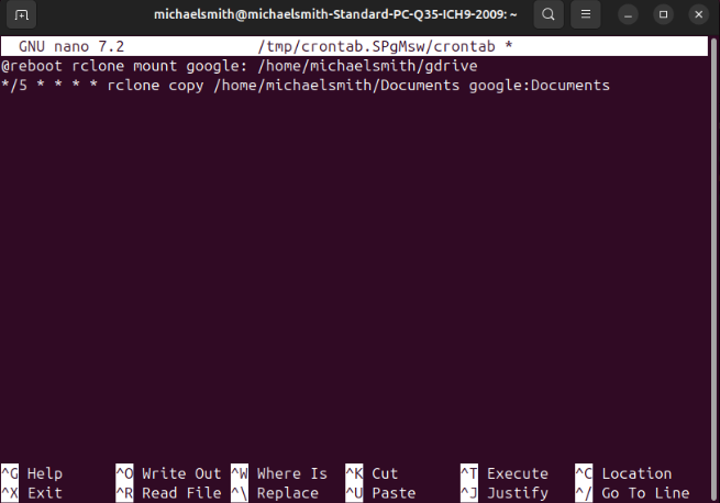 */5 * * * * rclone copy /home/YOURUSERNAME/Documents google:Documents