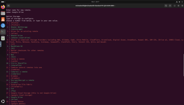 Dit zal het interactieve installatieprogramma starten, en u moet"New Remote" kiezen. Voer een naam in voor uw externe verbinding, deze kan van alles zijn, maar zou idealiter de provider van uw keuze moeten weergeven - in dit geval"Google". Zodra u de naam hebt gekozen, zou u een idee moeten krijgen van hoeveel cloudproviders Rclone ondersteunt.