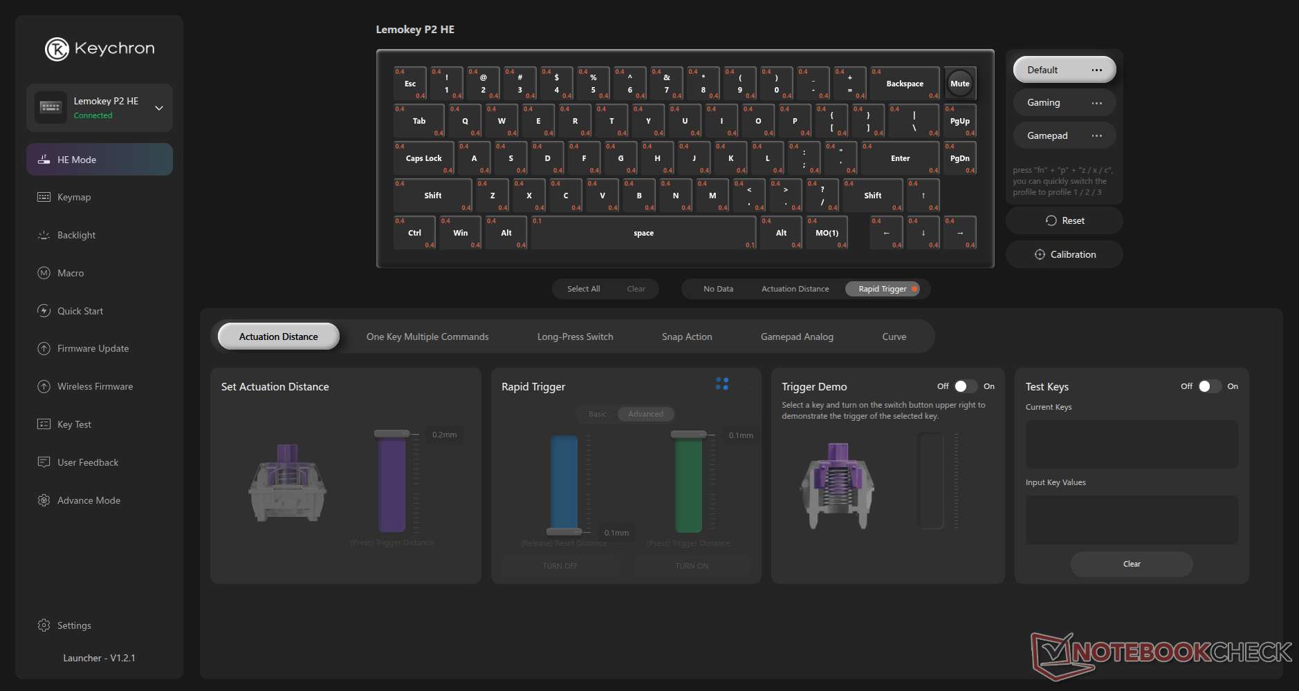 U kunt ook het volledige pakket klassieke Hall-effect functies, activeringspunt, snelle trigger, SOCD, mod tap, DKS en controlleremulatie aanpassen in Lemokey of Keychron Launcher.