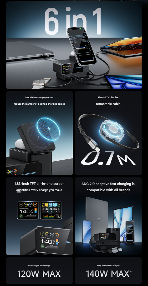 Het Cuktech 15 Super Charging Station is in China gelanceerd als een nieuwe, betaalbare desktop-oplader. De belangrijkste highlights zijn de dubbele draadloze oplaaddocks, één voor accessoires en één voor een telefoon. Naast de draadloze opladers is er een ingebouwde, intrekbare kabel van 0,7 meter en een ingebouwd digitaal display.