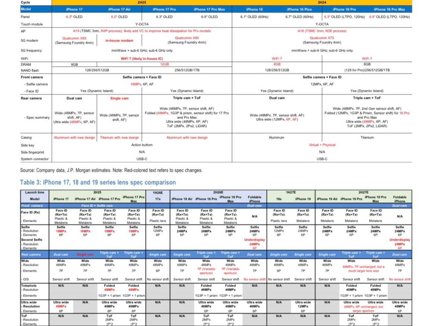 Industrieanalist Max Weinbach plaatste een spec-vergelijking van JP Morgan voor aankomende iPhone-modellen en daarin worden een iPhone Air 2 en een iPhone Air 3 genoemd. Weinbach wijst erop dat JP Morgan en andere banken "erg goed" zijn in het verkrijgen van dit soort informatie van de toeleveringsketen. Dit suggereert dat de toeleveringsketen Apple zich voorbereidt op de iPhone Air 2 en Air 3, of hoe ze uiteindelijk ook gaan heten, ondanks de slordige verkoop van de iPhone Air.