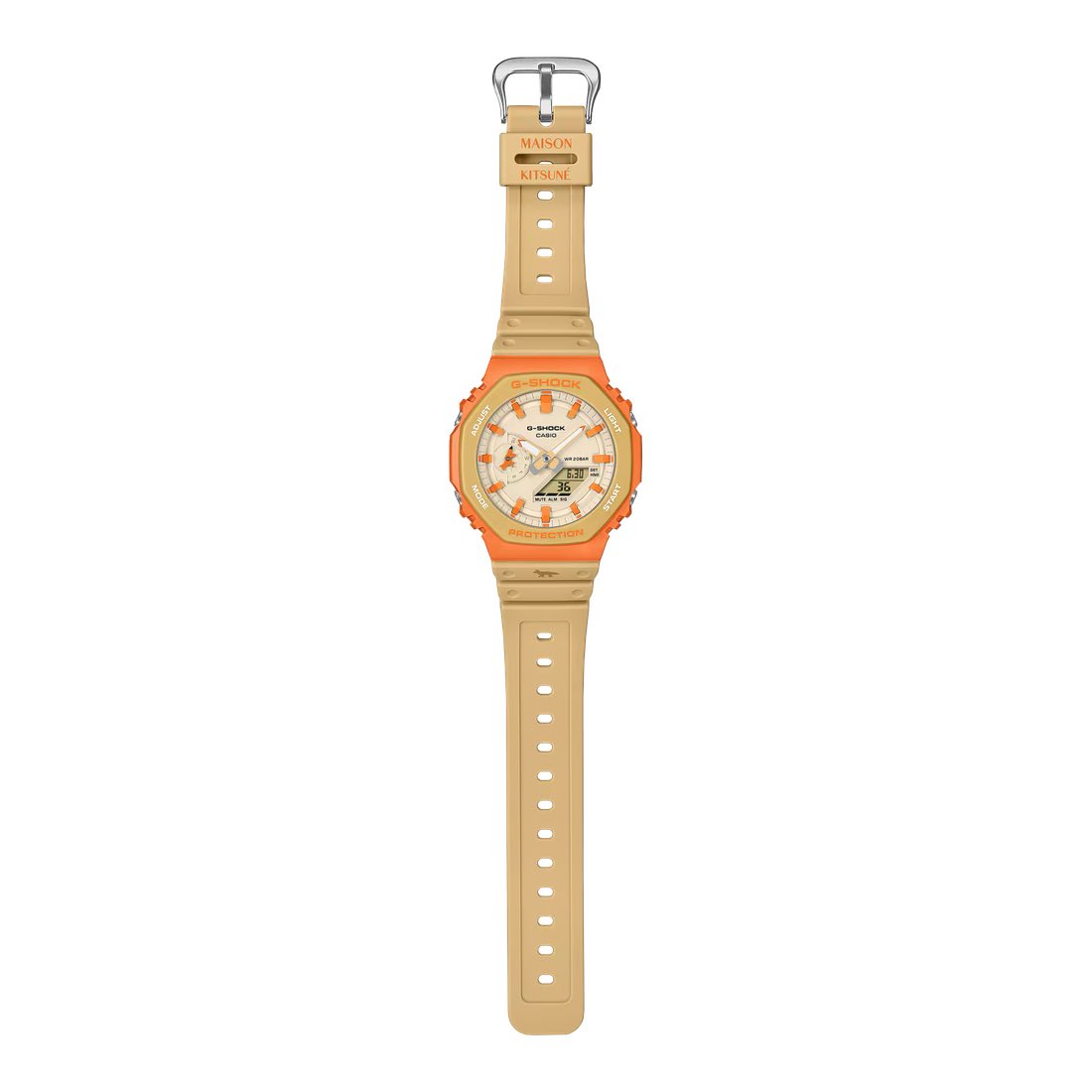 De GA-2110MK is een analoog digitaal horloge gebaseerd op de razend populaire achthoekige GA-2100-serie. Het maakt gebruik van het "camaieu" kleurenschema, waarbij neutrale, aardachtige beige en crèmekleurige tinten worden gebruikt die geïnspireerd zijn op de historische Haussmanniaanse architectuur van Parijs. De gedempte tinten worden onderbroken door een fel oranje lunette van hars, die volgens Casio is bedoeld om de zonsondergang op te roepen die over de skyline van Parijs schijnt. Het horloge wordt geleverd in een speciale verpakking die past bij het kleurenschema van Camaieu.