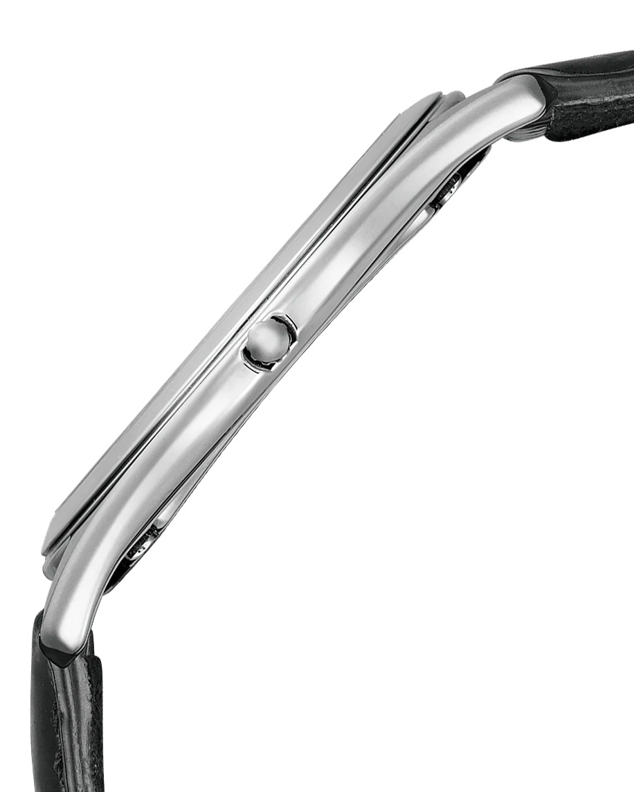 De AQ5010-01A heeft een kastdiameter van 36,6 mm, wat matig is en past bij formele gelegenheden. Het horloge heeft een helderwitte wijzerplaat, een goudkleurige wijzerplaat en een zwarte subdial voor de kleine seconden die de wijzerplaat een gelaagde uitstraling geeft. De cijferring is omlijst met zwart, wat de wijzerplaat een sterk contrast geeft zonder aan leesbaarheid in te boeten. Dit alles wordt gecombineerd met een glanzende zwarte leren band met een krokodillenpatroon.