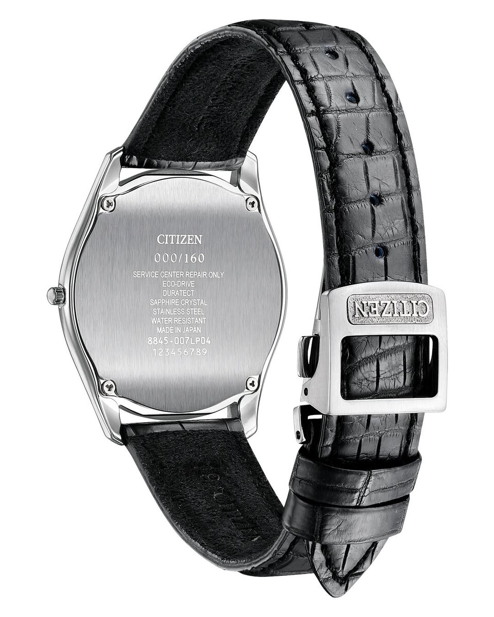 Aan de achterkant laat het horloge duidelijk zijn identiteit zien met een geborstelde achterkant van de kast met de stempel "000/160", die verwijst naar de status van gelimiteerde oplage. Het loopt op het Citizen 8845 Eco-Drive uurwerkdat het horloge aandrijft via omgevingslicht en dat geen vervanging van de batterij nodig heeft. Duratect-uitharding, een krasbestendig saffierglas en een in Japan gemaakte constructie maken de lijst met premium specificaties compleet.