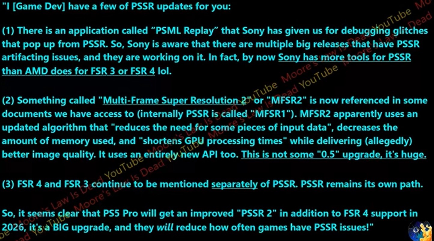 De leaker beweert dat de PSSR2, die intern de Mult-Frame Super Resolution 2 of MFSR2 wordt genoemd, een nieuw algoritme en gloednieuwe API's gebruikt. PSSR2 heeft naar verluidt als doel om enorme verbeteringen in beeldkwaliteit te leveren ten opzichte van PSSR, terwijl het de "GPU-verwerkingstijd" vermindert en minder geheugen gebruikt. De bron van MLID beweert dat PSSR2 niet slechts een kleine "0.5" update is, maar een "enorme".
