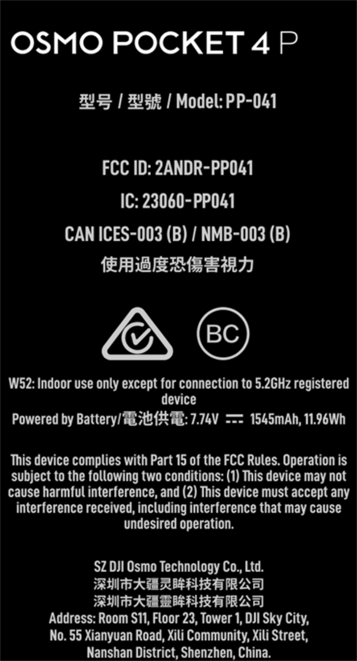 De FCC heeft nog niet onthuld hoe de Osmo Pocket 4 Pro eruitziet. In plaats daarvan heeft de regelgevende instantie ermee ingestemd om tot eind juni 2026 geen foto's te publiceren. In de tussentijd heeft de FCC bevestigd dat de Osmo Pocket 4 Pro gebruik maakt van een 1.545 mAh batterij (7,7 V). Dit is een aanzienlijke upgrade ten opzichte van de 1.300 mAh batterij in de Osmo Pocket 3komt deze capaciteit overeen met die van de Osmo Pocket 4. Desalniettemin bevestigt de FCC-certificering vrijwel dat DJI de Osmo Pocket 4 Pro wereldwijd zal uitbrengen.