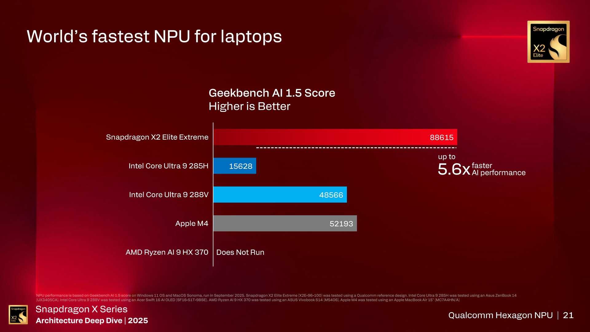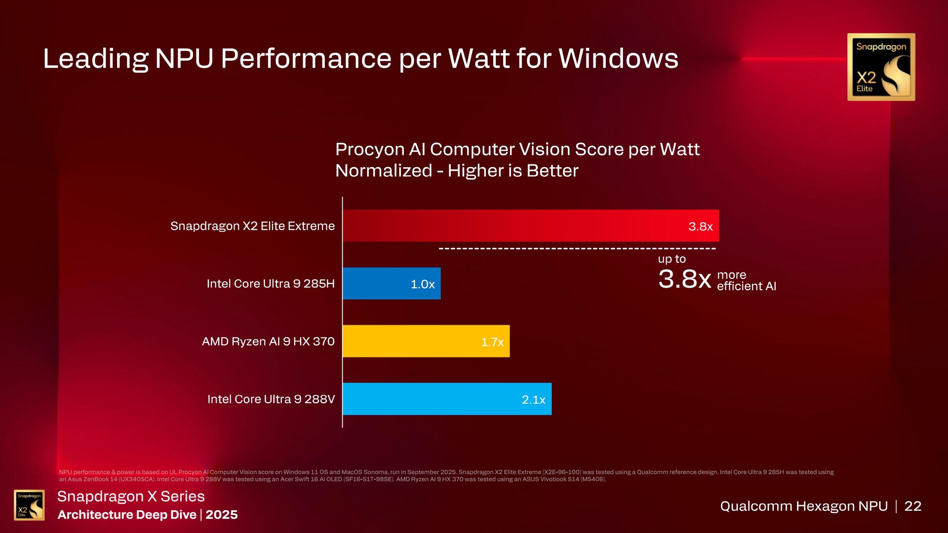 Qualcomm prijst de Hexagon NPU 6 in de Snapdragon X2 Elite Extreme aan als 's werelds snelste, met tot 5,7x hogere prestaties en 3,8x hogere efficiëntie in vergelijking met de Core Ultra 9 285HnPU in Procyon AI Computer Vision.