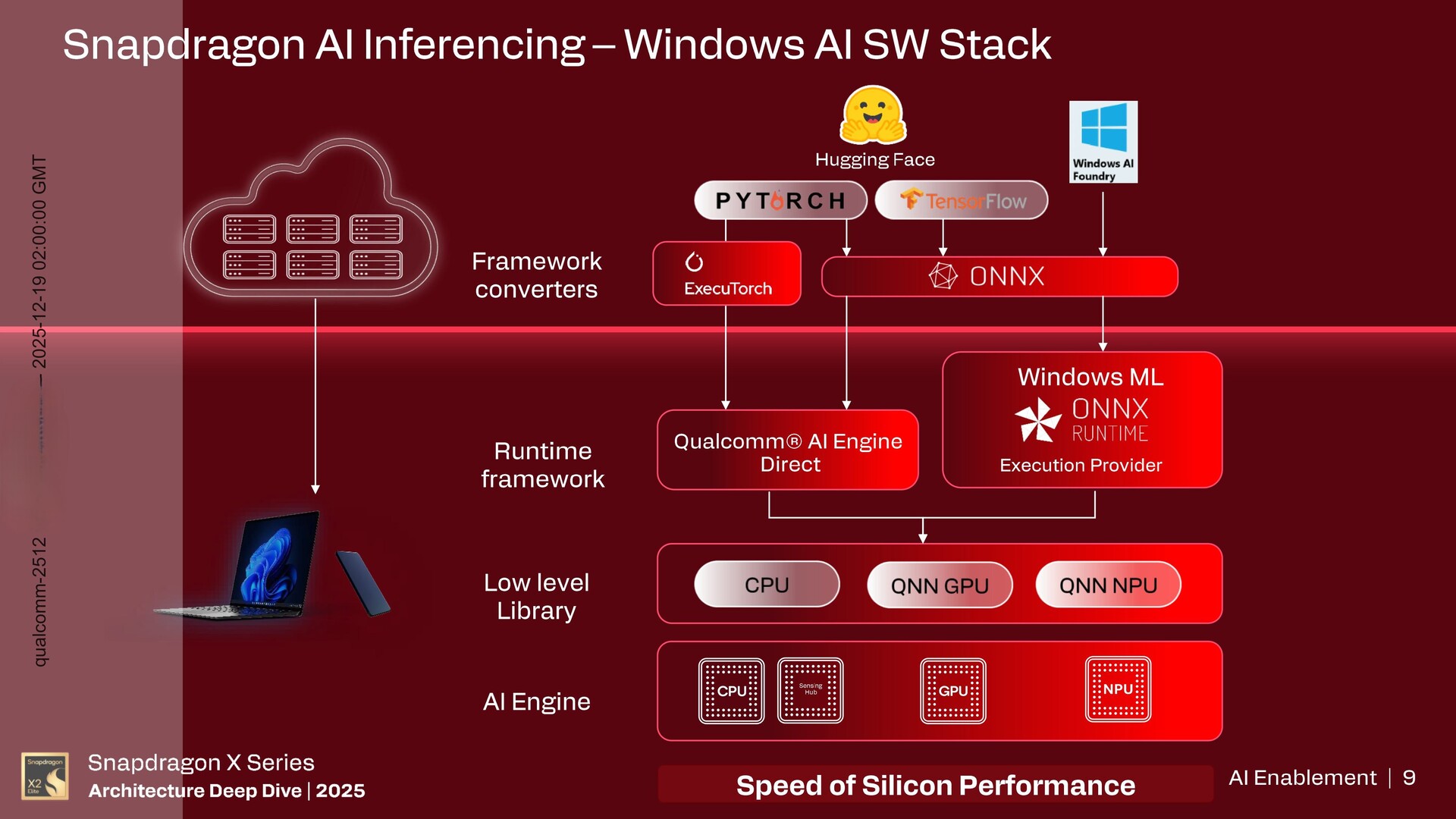 Qualcomm zegt dat Snapdragon AI inferencing werkt met de Windows AI software stack om next gen agentic workloads mogelijk te maken. Ondersteunde open ML frameworks zijn PyTorch en TensorFlow.