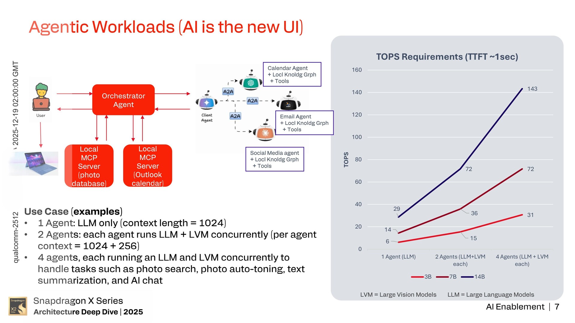 Qualcomm benadrukte hoe een enkele LLM-agent met een contextlengte van 1024 en 14 miljard parameters (14B) tot 143 TOPS aan AI-verwerkingskracht zou vereisen, terwijl agentic use cases met twee (3B) of vier agenten (7B), die elk tegelijkertijd een LLM en LVM uitvoeren, tot 72 TOPS kunnen vereisen.