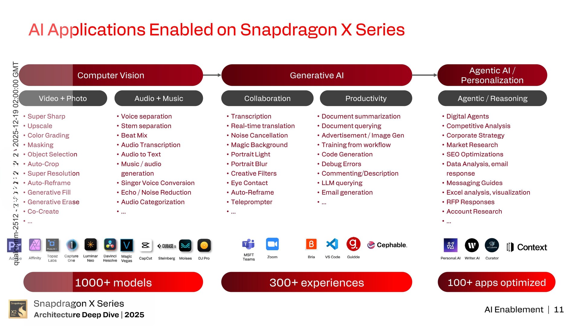 Snapdragon X-serie SoC's laptop CPU's ondersteunen momenteel meer dan 1000 modellen en meer dan 300 ervaringen op het gebied van audio, video, foto's, generatieve AI, agentische AI en redeneren.