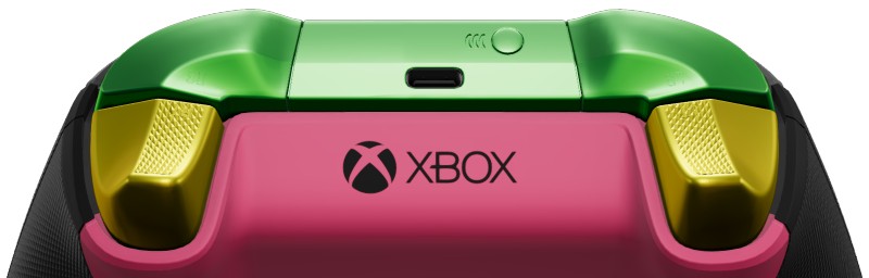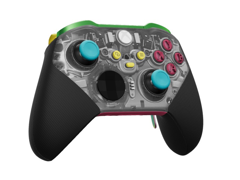 Het High on Life 2 Design Lab-thema biedt een heldere, kleurrijke kijk op de Xbox Series X-controller. De voorkant heeft een semi-transparante frontplaat in combinatie met zwarte handgrepen, terwijl blauwe joysticks, roze ABXY-knoppen en gele menuknoppen voor een sterk contrast zorgen. Aan de achterkant wordt een dieproze achterkant gecombineerd met groene bumpers en gouden triggers. Het is een kleurrijk herontwerp dat voortborduurt op de luide, chaotische esthetiek van High on Life 2.