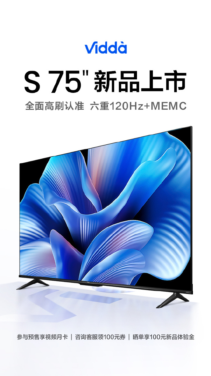 De Hisense Vidda S75 smart TV is gelanceerd in China. Het 75-inch model heeft een 4K-scherm met een verversingssnelheid van 120 Hz en meer dan 1,07 miljard kleuren. De TV ondersteunt HDR, met beeldverbeterende tools zoals MEMC motion smoothing, een variabele verversingssnelheid en een auto low latency modus.