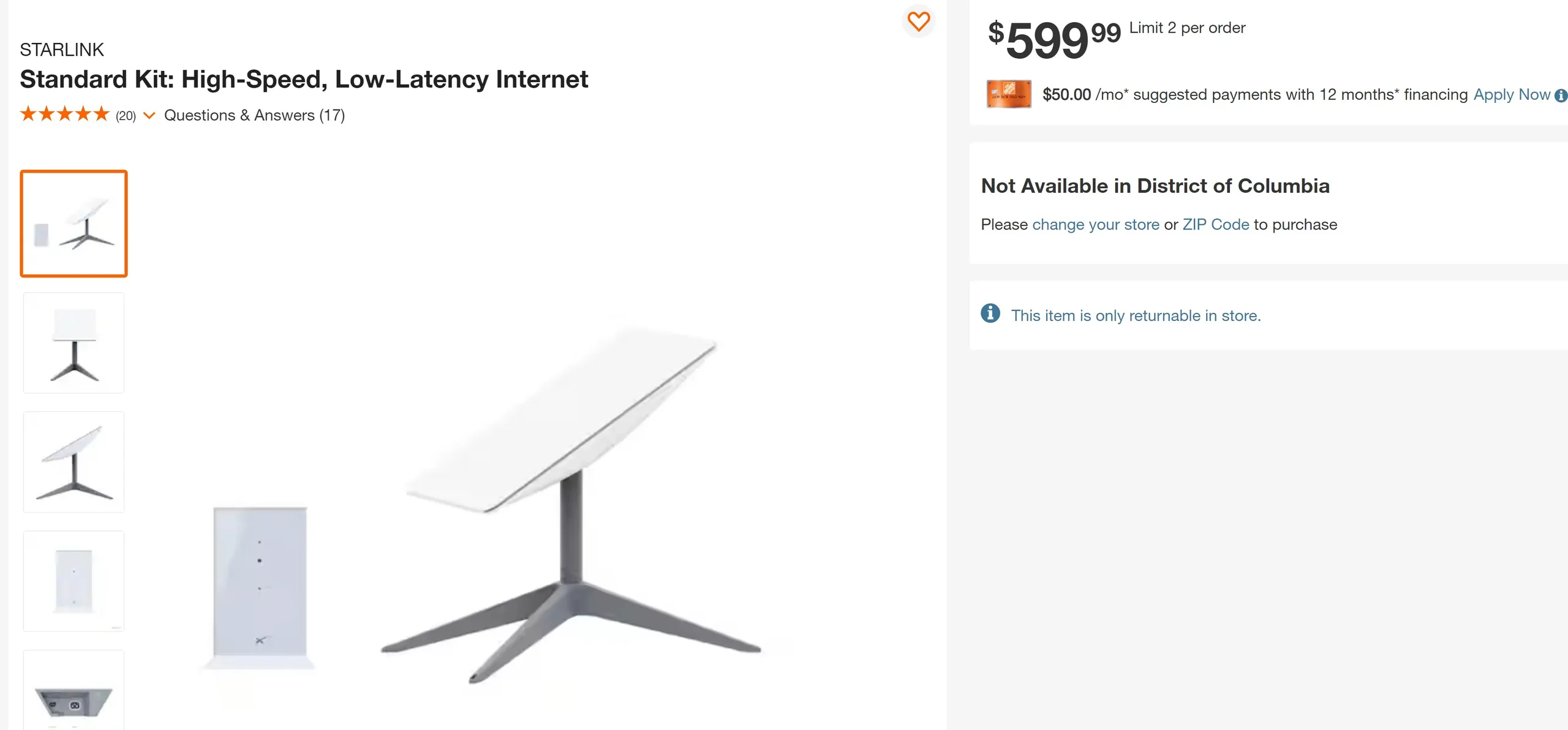De Starlink-kit bestaat uit de eigenlijke satellietinternetschotel, een WiFi-router, de voeding, de verbindingskabels en de basis om de set op te installeren. Home Depot verkoopt de Starlink-sets alleen in geselecteerde winkels omdat Starlink niet overal in de VS dekking biedt. Toekomstige Starlink-abonnees hebben ook de mogelijkheid om de set bij hun plaatselijke winkel te bestellen en deze dan gewoon op te halen. Home Depot accepteert echter alleen in-store retourzendingen van Starlink-apparatuur.
