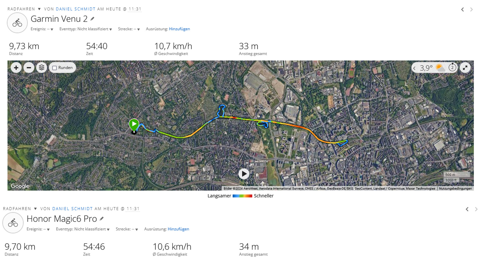 Tijdens een fietstocht vergelijken we de nauwkeurigheid van de routetracking met de Garmin Venu 2 fitness smartwatch. Geen van beide toestellen werkt vlekkeloos, maar ze liggen heel dicht bij elkaar, en de Honor smartphone is zelfs iets nauwkeuriger op het keerpunt. Hij levert ook zeer nauwkeurige hoogtewaarden.