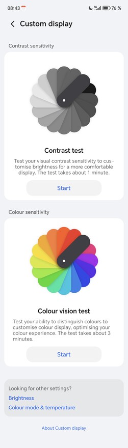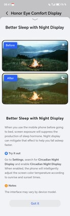 Het centrale contactpunt in de Honor Magic8 Pro systeem is het menu-item "Honor Eye Comfort Display", waar alle extra functies direct geregeld kunnen worden. Naast hoogfrequent PWM-dimmen, dat zowel op 3.840 Hz als op 4.320 Hz kan worden gebruikt bij een lage helderheid van het scherm, zijn er ook veelgebruikte functies zoals "Natural Tone", dat de schermkleuren aanpast aan het omgevingslicht. Dit resulteert in een warmer scherm, omdat het aandeel blauw licht wordt verminderd. De "Circadian Night Display" werkt op een vergelijkbare manier en is ontworpen om de onderdrukking van slaaphormonen 's avonds te verminderen. Er is ook een configureerbare donkere modus zodat het scherm 's avonds inhoud in een donkerdere toon weergeeft, wat de meeste andere Android smartphones ook bieden.