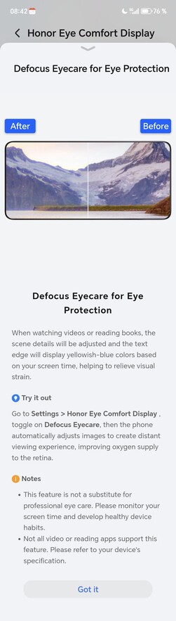 Een andere Honor-specifieke functie is "Defocus Eyecare" die het kijken in de verte simuleert om vermoeide ogen te verlichten en meer dan 2000 apps ondersteunt. De Magic8 Pro kan ook bewegingsziekte verlichten die veroorzaakt wordt door het reizen in een voertuig. Aan de rand van het scherm worden gekleurde ballen weergegeven, die meebewegen met de versnelling van het voertuig. Dit is bedoeld om mogelijke duizeligheid of misselijkheid te verminderen. In de praktijk heeft dit verrassend goed gewerkt.