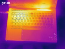 Volgens onze metingen bereiken de oppervlakken van de Honor laptop bij belasting maximumtemperaturen tot 47 °C (117 °F). De warmste plek is het achterste gedeelte aan de onderkant, en de temperatuur van de palmsteunen blijft altijd gematigd. Dit betekent dat u de laptop altijd kunt blijven gebruiken, zelfs bij hogere belasting