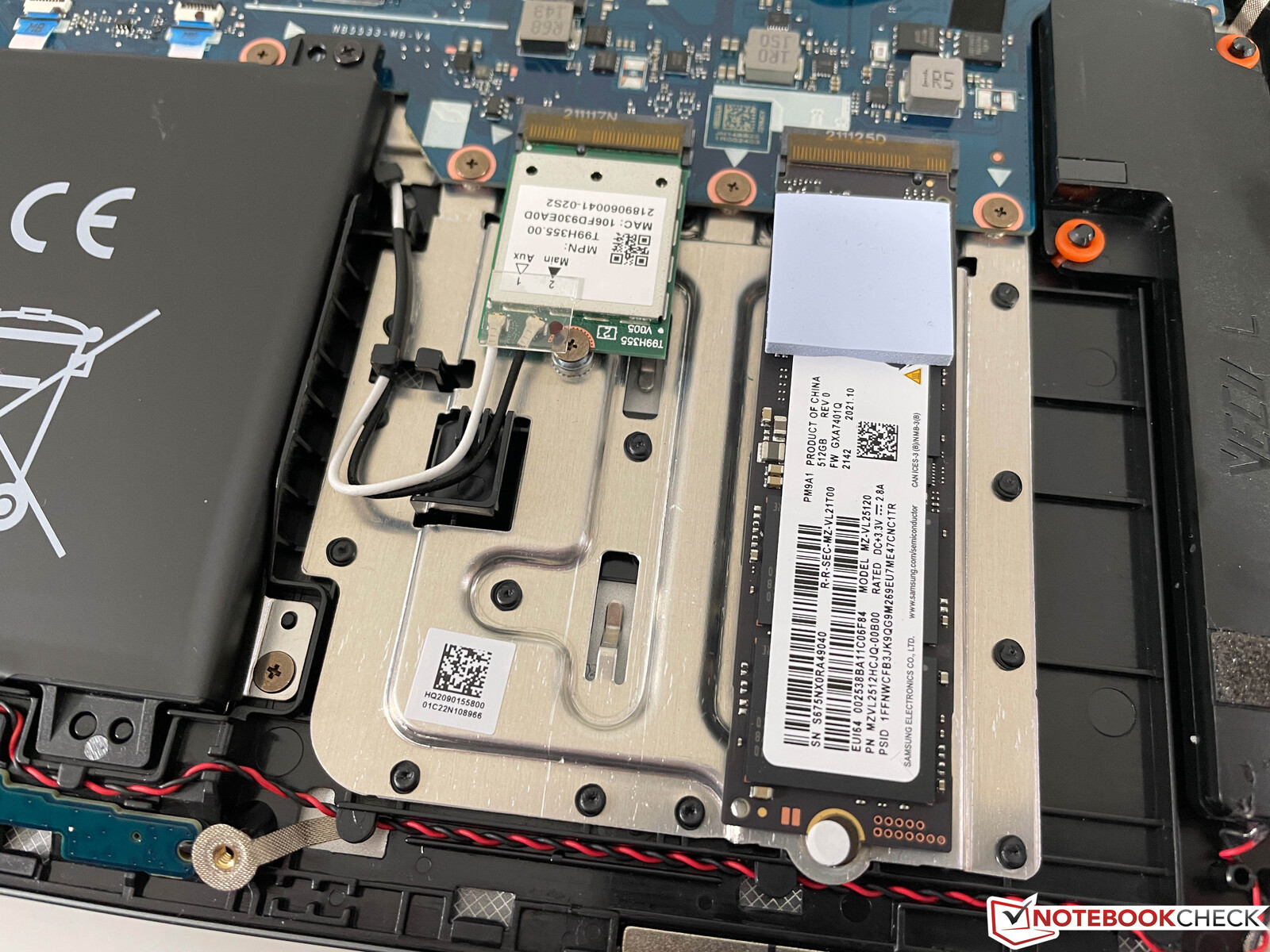 Het onderste deksel van de behuizing is bevestigd met tien Torx schroeven (T5) en kan gemakkelijk worden verwijderd. Binnenin krijg je toegang tot de ventilatoren, de M.2-2280 SSD, en ook de WLAN module (M.2-2232). Het werkgeheugen is echter gesoldeerd en kan niet worden uitgebreid. Gezien de grote 16-inch behuizing, zou hier zeker wat meer optimalisatie mogelijk zijn, ofwel voor een grotere batterij, ruimte voor een andere SSD, of normale RAM slots.