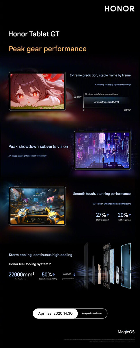 Met de lancering van de Pad GT om de hoek, heeft Honor nu een tipje van de sluier opgelicht over de hardware waaruit de volgende gaming-tablet zal bestaan. Aan de ene kant is bevestigd dat de Honor Pad GT een 10.100 mAh batterij zal hebben die 66 W bedraad snelladen ondersteunt, zoals veel van Honor's mid-range smartphones. In een reeks nieuwe teaserafbeeldingen heeft het bedrijf ook aangegeven dat de Pad GT zijn batterij onder controle zal houden via een 22.000 mm² dampkamer koeloplossing.