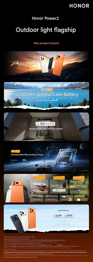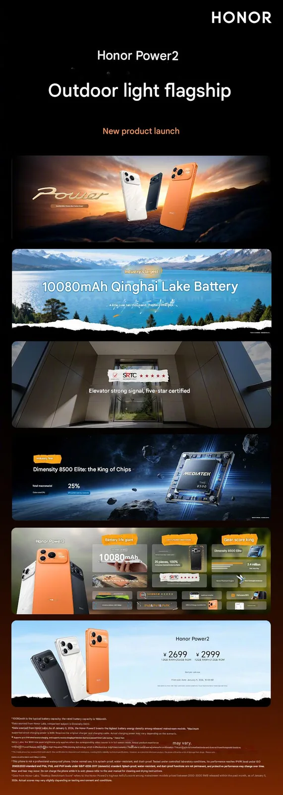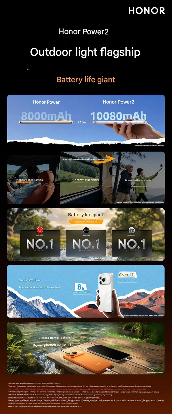 Honor kan qua specificaties niet concurreren met Apple, met uitzondering van de batterij. De 10.080 mAh batterijmodule in de ultradunne smartphone van 8 mm, gecombineerd met de nieuwe Dimensity 8500 Elite mid-range chipset van MediaTek, levert naar verluidt 8,3 uur ononderbroken live streaming, 32,5 uur binge-watching of 17,3 uur navigatie. Er wordt ook gezegd dat hij betrouwbaar werkt in extreem koude temperaturen. Dankzij 27 watt omgekeerd opladen kan de smartphone ook als powerbank worden gebruikt, en de enorme batterij kan met maximaal 80 watt worden opgeladen.