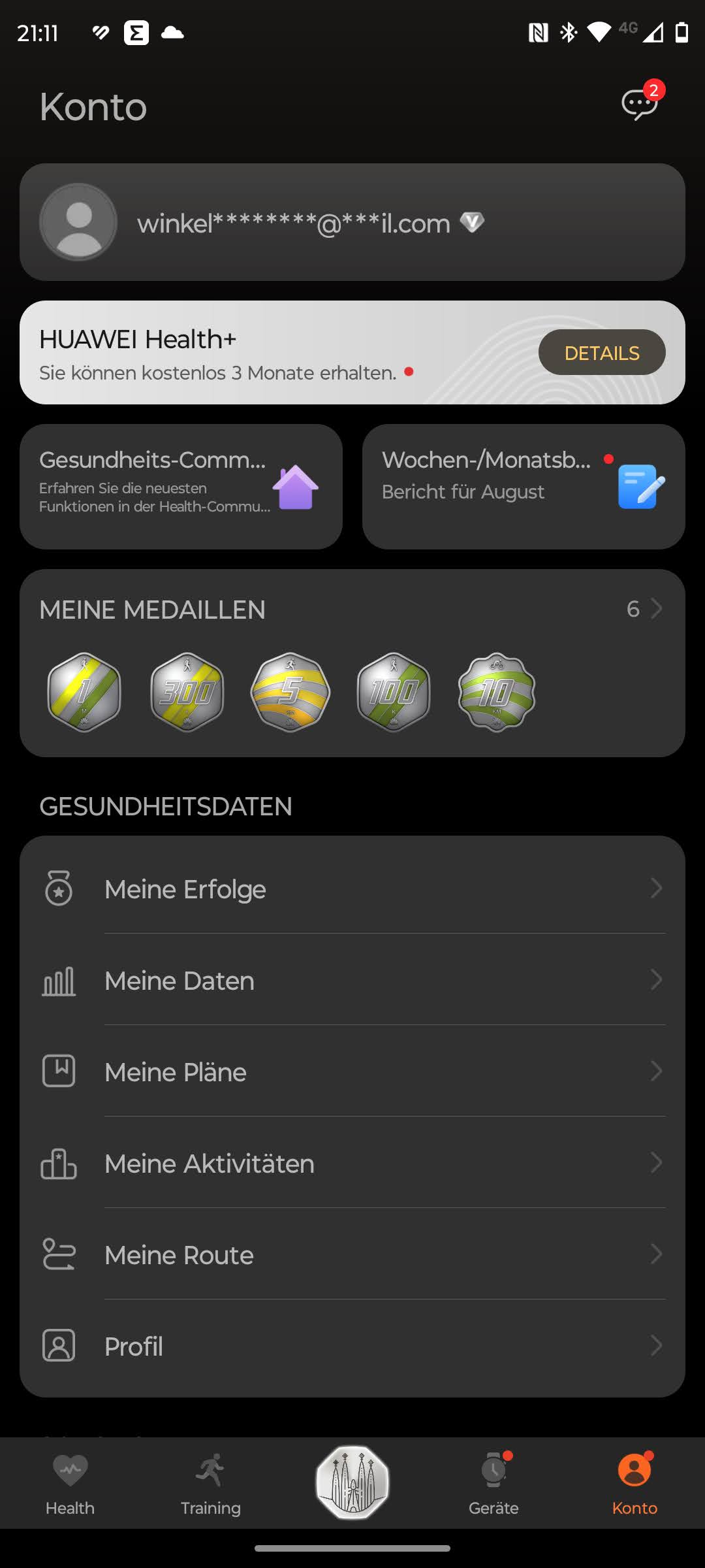 Alle geregistreerde gezondheidsgegevens worden verzameld en geëvalueerd in de Huawei Health app. De gegevens worden niet gesynchroniseerd met Google Fit, maar het is mogelijk om Strava- en Komoot-accounts te koppelen. Je kunt ook verbinding maken met Adidas Runtastic - je krijgt de premium versie van deze software drie maanden gratis bij aankoop van de Band 8.