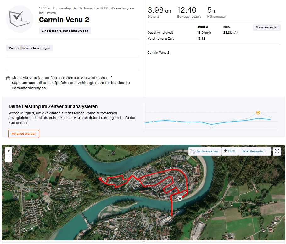 De smartphone doorstaat onze praktische test, een fietstocht met de Garmin Venu 2 als vergelijkingstoestel, met glans: Afgezien van een kleine afwijking aan het einde van de rit, is de traceerbaarheid van de Mate 50 Pro zeer nauwkeurig