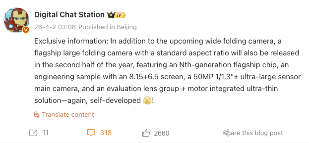 Verder vermeldt de leaker dat de Huawei Mate X8 zal worden aangedreven door een "vlaggenschipchip van de negende generatie", wat waarschijnlijk de Kirin 9040 Pro zal zijn, de opvolger van de Kirin 9030 Pro van de Mate X7. De aankomende opvouwbare camera heeft naar verluidt een 50 MP 1/1,3 inch grote sensor voor de hoofdcamera. Dat is ongeveer alle informatie die de leaker heeft gedeeld.