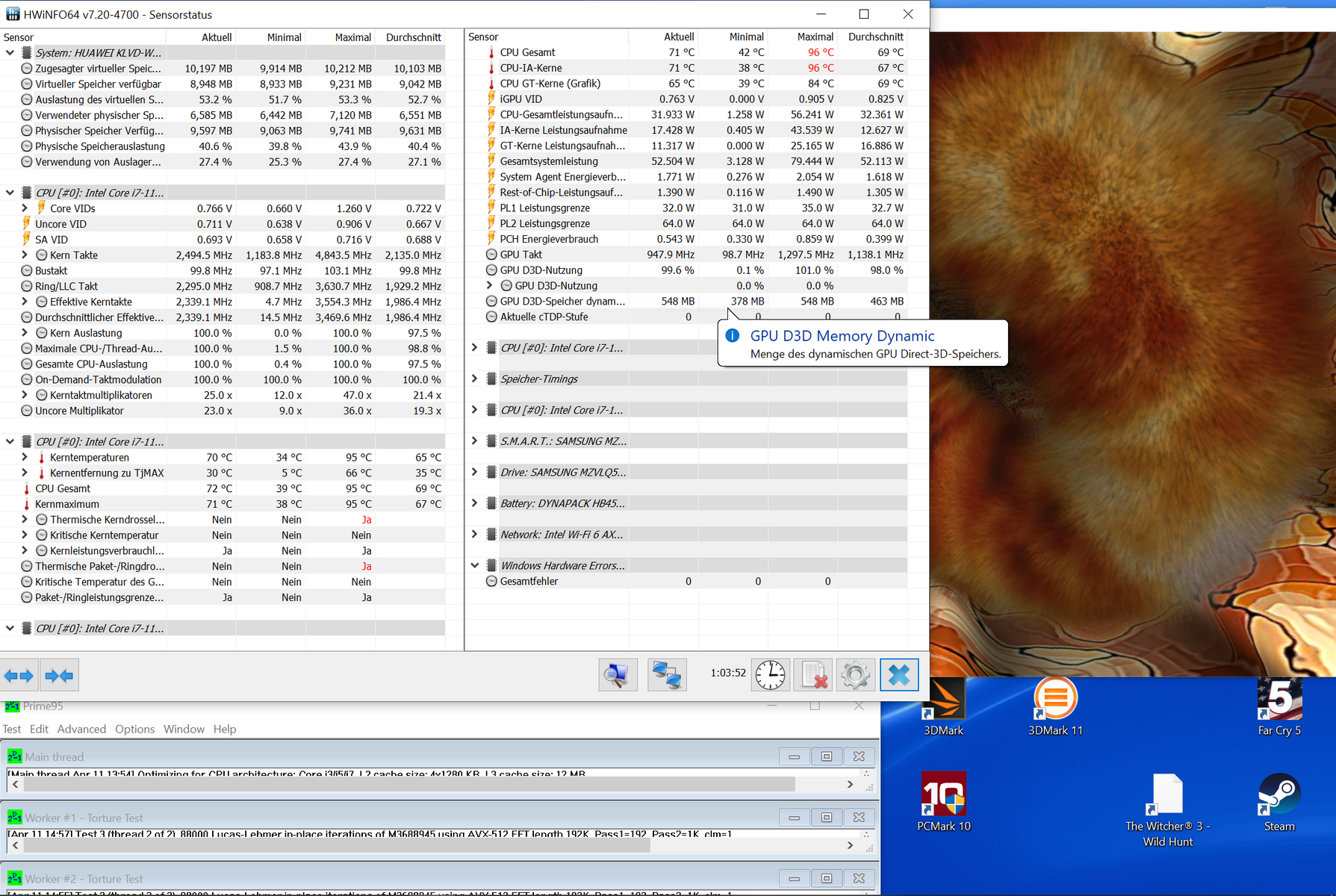 In onze gecombineerde stresstest (Prime 95 + FurMark) is de snelheid van de Intel CPU 2,1 GHz, wat duidt op aanzienlijke throttling. In het dagelijks gebruik zul je zo'n veeleisend scenario echter niet lang tegenkomen. De CPU blijft koel bij 66 °C (151 °F), en gedurende die tijd heeft de Intel Xe G7 (96 EUs) een kloksnelheid van 1.150 MHz.