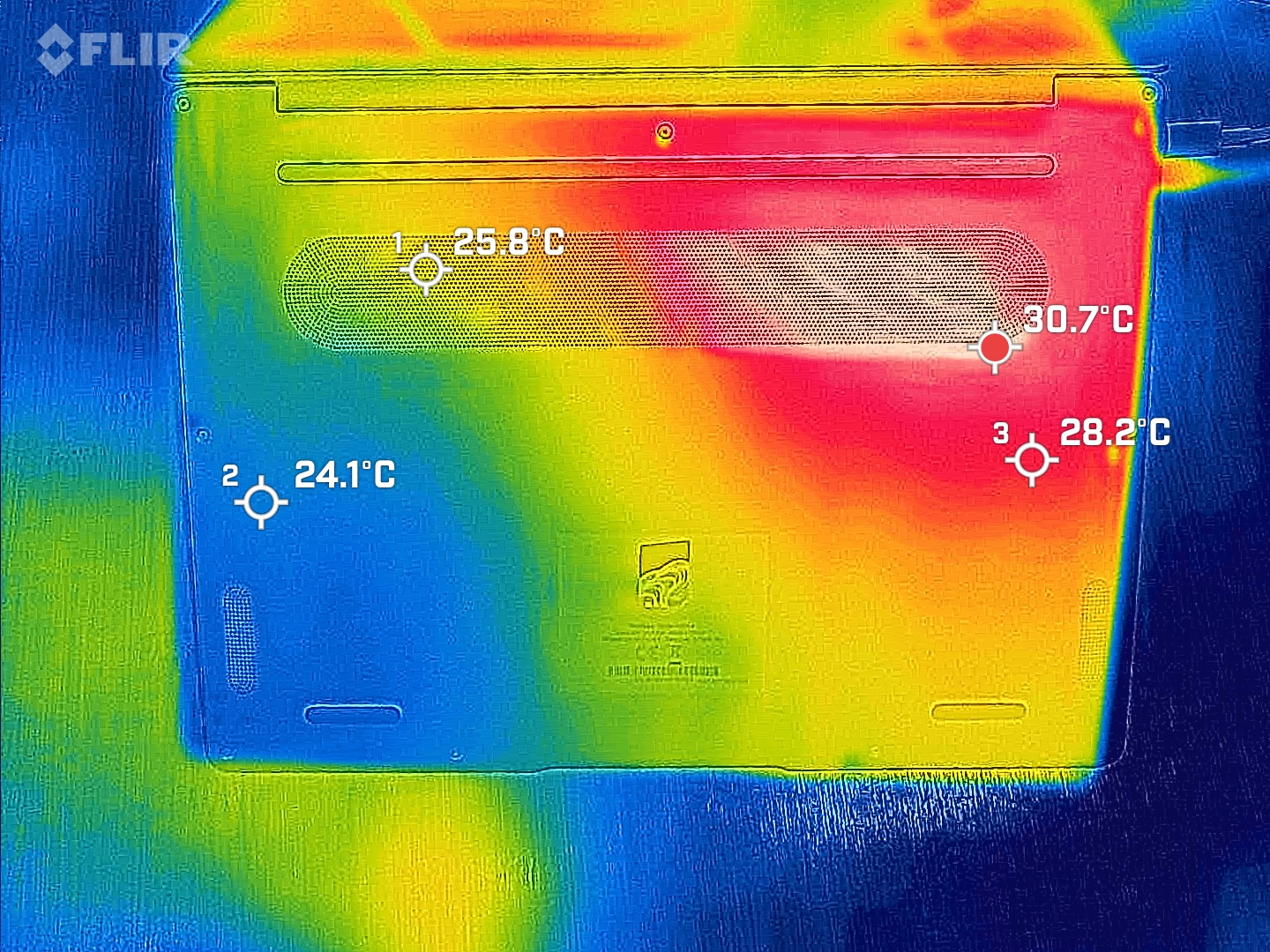 (-) De maximumtemperatuur aan de bovenzijde bedraagt 45.2 °C / 113 F, vergeleken met het gemiddelde van 35.9 °C / 97 F, variërend van 21.4 tot 59 °C voor de klasse Subnotebook.