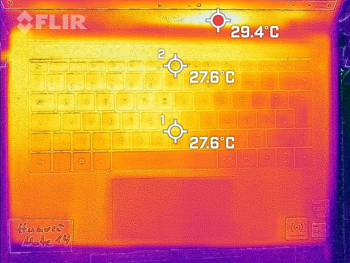 Bij een maximum van 41,7 °C onder belasting blijft de Huawei MateBook D 14 erg koel. De ThinkPad E14 G3 AMD heeft bijvoorbeeld aanzienlijk hogere kasttemperaturen dan 49 °C, terwijl de MacBook Air met 44 °C ook iets warmer wordt.
