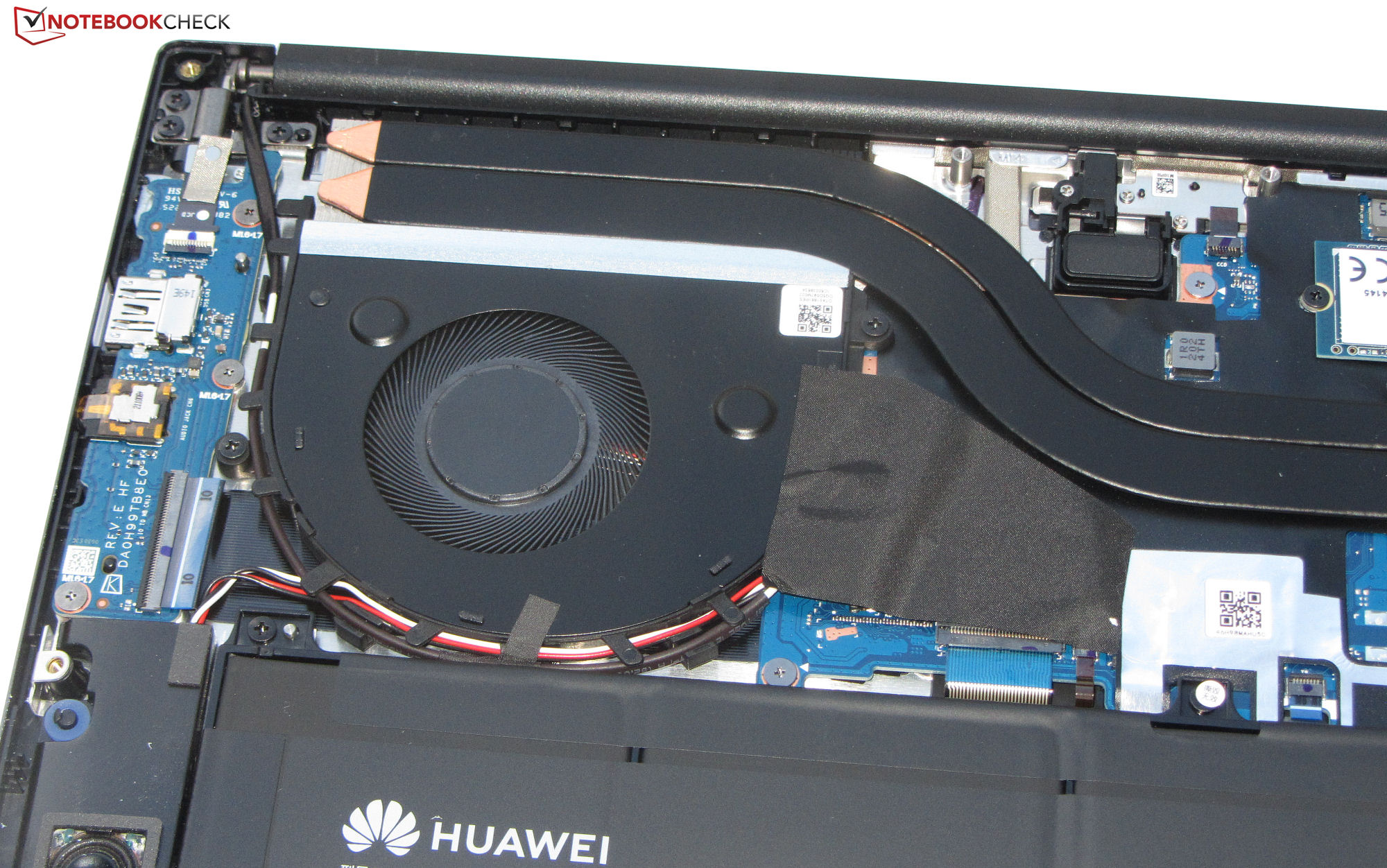Bij stationair en dagelijks gebruik (kantoor, internet) blijft de ventilator meestal uitgeschakeld en heerst er volledige stilte. Onder gemiddelde tot hoge belasting (stress test, The Witcher 3 test) kan het geluidsniveau oplopen tot 43 dB(A), maar deze waarde moet je met een korreltje zand nemen. De MateBook werkt meestal stil of zelfs geruisloos. Wanneer de "Balanced" modus is geactiveerd, wordt de activiteit van de ventilator zo beperkt mogelijk gehouden.