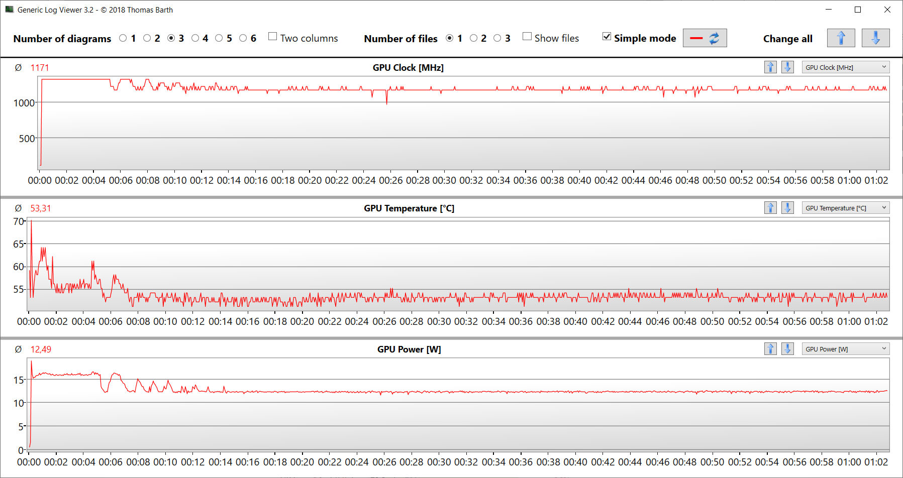 De stress test met Prime95 en FurMark constant draaiend vormt een extreem scenario om de stabiliteit van het systeem onder volledige belasting te evalueren. De kloksnelheid van de CPU daalt van 2,9 GHz in het begin naar 700 MHz tot 1,1 GHz in de loop van de test. De kloksnelheid van de grafische kern daalt van 1300 naar 750 MHz.