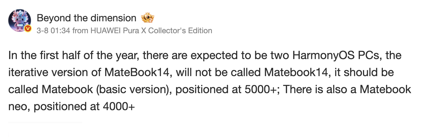 Naar verluidt is Huawei van plan om een direct alternatief aan te bieden onder de naam MateBook Neo. De MateBook Neo werd in januari voor het eerst genoemd door Digital Chat Station en verschijnt mogelijk samen met een opgefriste MateBook 14. Wanneer precies is op dit moment nog niet duidelijk. Wanneer precies is op dit moment nog niet duidelijk. Toch verwacht Hyperdimensional Realm dat Huawei de MateBook Neo voor ongeveer CNY 4.000 (~$575) zal aanbieden, met een ongeveer CNY 1.000 (~$145) goedkopere vanafprijs dan de volgende MateBook 14.