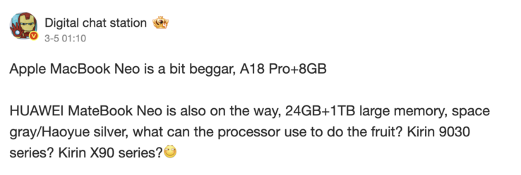 Ondertussen meldt Digital Chat Station dat de MateBook Neo zal worden uitgerust met dezelfde Kirin 9030 Pro chipset die in de Mate X7, Mate 80 Pro Max, Mate 80 RS Ultimate en sommige versies van de Mate 80 Pro. De Kirin 9030 Pro is een chipset uit de 5 nm-klasse en heeft 9 CPU-kernen, 14 threads en een Maleoon 935 GPU.