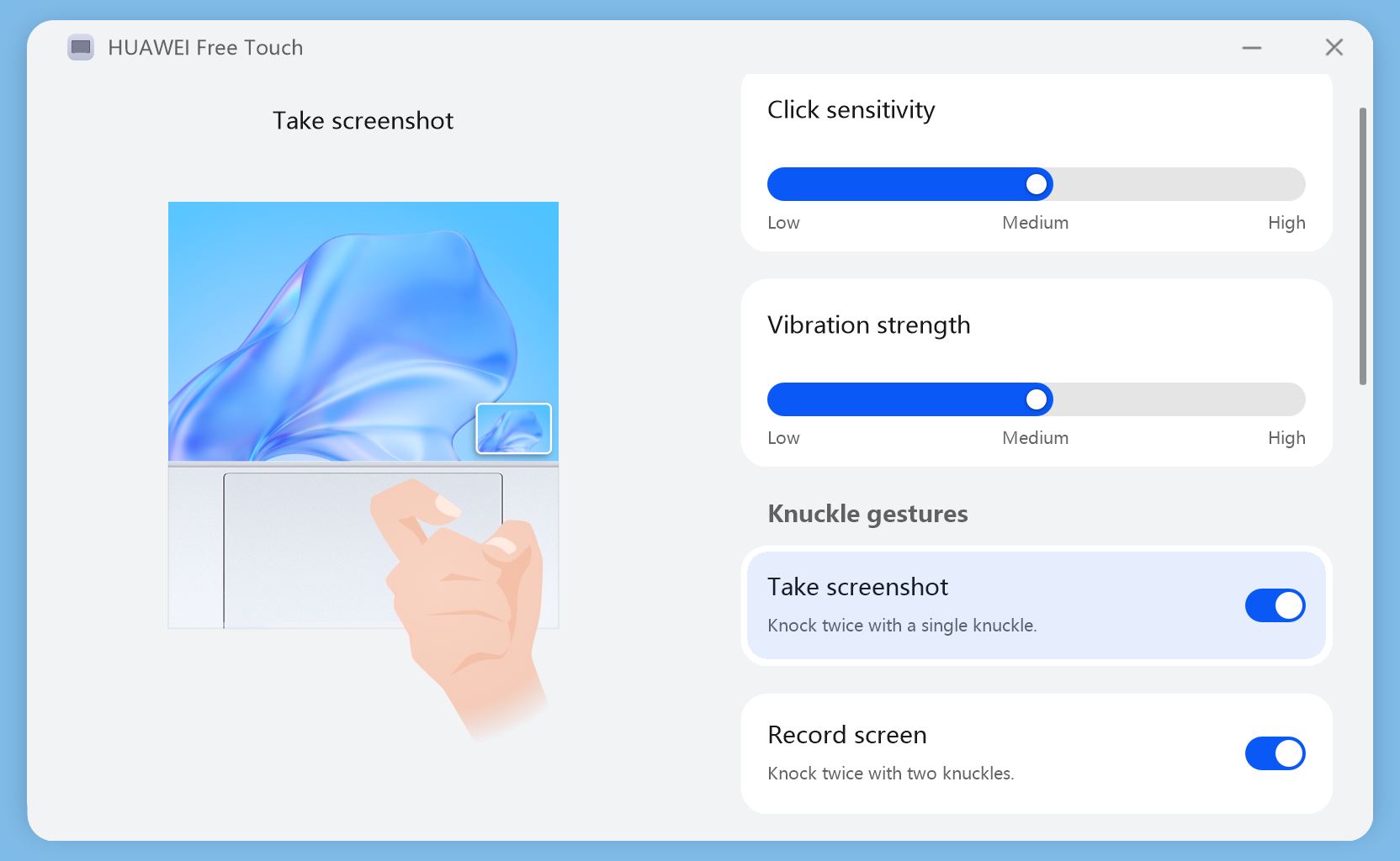 Het touchpad is absoluut een van de hoogtepunten van de nieuwe MateBook X Pro 2022. Het is niet alleen erg groot, en reikt helemaal tot aan de voorste rand van de behuizing (inclusief de uitsparing), maar het biedt ook een heleboel extra functies. Huawei groepeert deze onder de term FreeTouch, waarbij het gaat om extra gebaren. Zo kun je bijvoorbeeld langs de twee verticale randen scrollen om de helderheid of het volume van het scherm te wijzigen, wat ook wordt ondersteund door een haptisch rastereffect. Je kunt ook door video's of muziek scrollen door langs de bovenste rand te scrollen. Er zijn ook andere gebaren beschikbaar, die in de onderstaande schermafbeeldingen worden getoond.