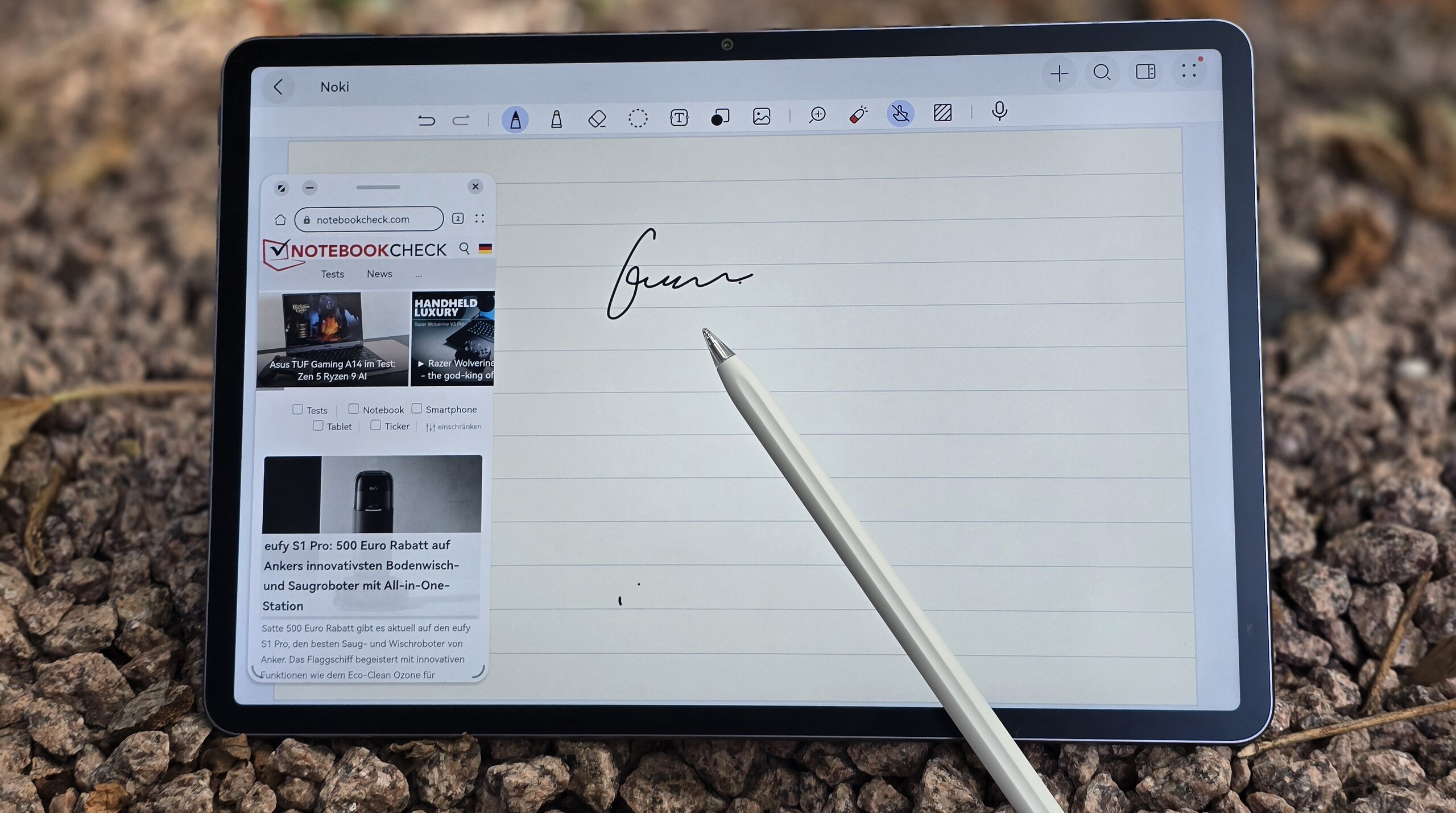 Het glazen oppervlak met de speciale coating voelt prettig aan en de stylus zorgt ook voor een natuurlijkere schrijf- en tekenervaring dan op een gaming paneel. De weerstand van een vel papier wordt zeker niet gehaald, maar het is nog steeds leuk om met het M-Pencil op het 11,5 inch scherm te schrijven. Huawei specificeert een zeer hoge drukgevoeligheid van meer dan 10.000 niveaus en de latentie blijkt ook laag in onze test. De pen is magnetisch bevestigd aan de behuizing en wordt draadloos opgeladen.
