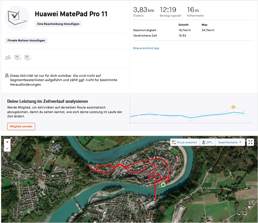 In onze praktijktest, die bestaat uit het opnemen van een fietstocht met ons testtoestel en de Garmin Venu 2 smartwatch ter vergelijking, presenteert de MatePad Pro 11 zich als een behoorlijk betrouwbaar navigatietoestel. Dat gezegd zijnde, plaatst het ons af en toe naast de baan. Gebruikers die maximale precisie vereisen zijn dus beter af met alternatieven, hoewel de nauwkeurigheid nog steeds voldoende is voor dagelijks gebruik.