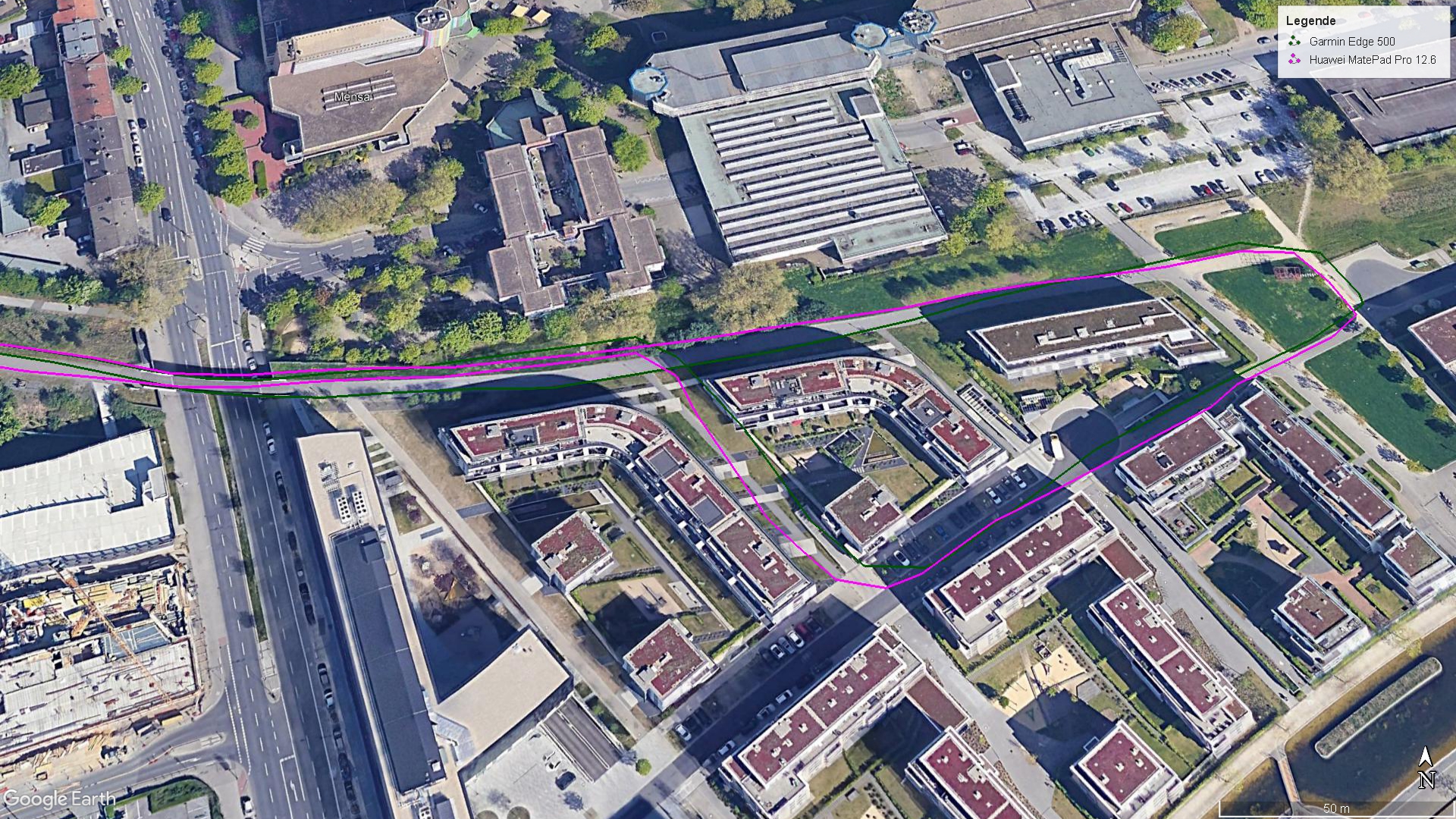 In de praktische test, een fietstocht van 10 kilometer (~6,2 mijl), werkt de MatePad Pro 12.6 veel betrouwbaarder en levert een aangenaam resultaat: De tablet registreert de route bijna net zo nauwkeurig als het Garmin Edge 500 professionele navigatietoestel.