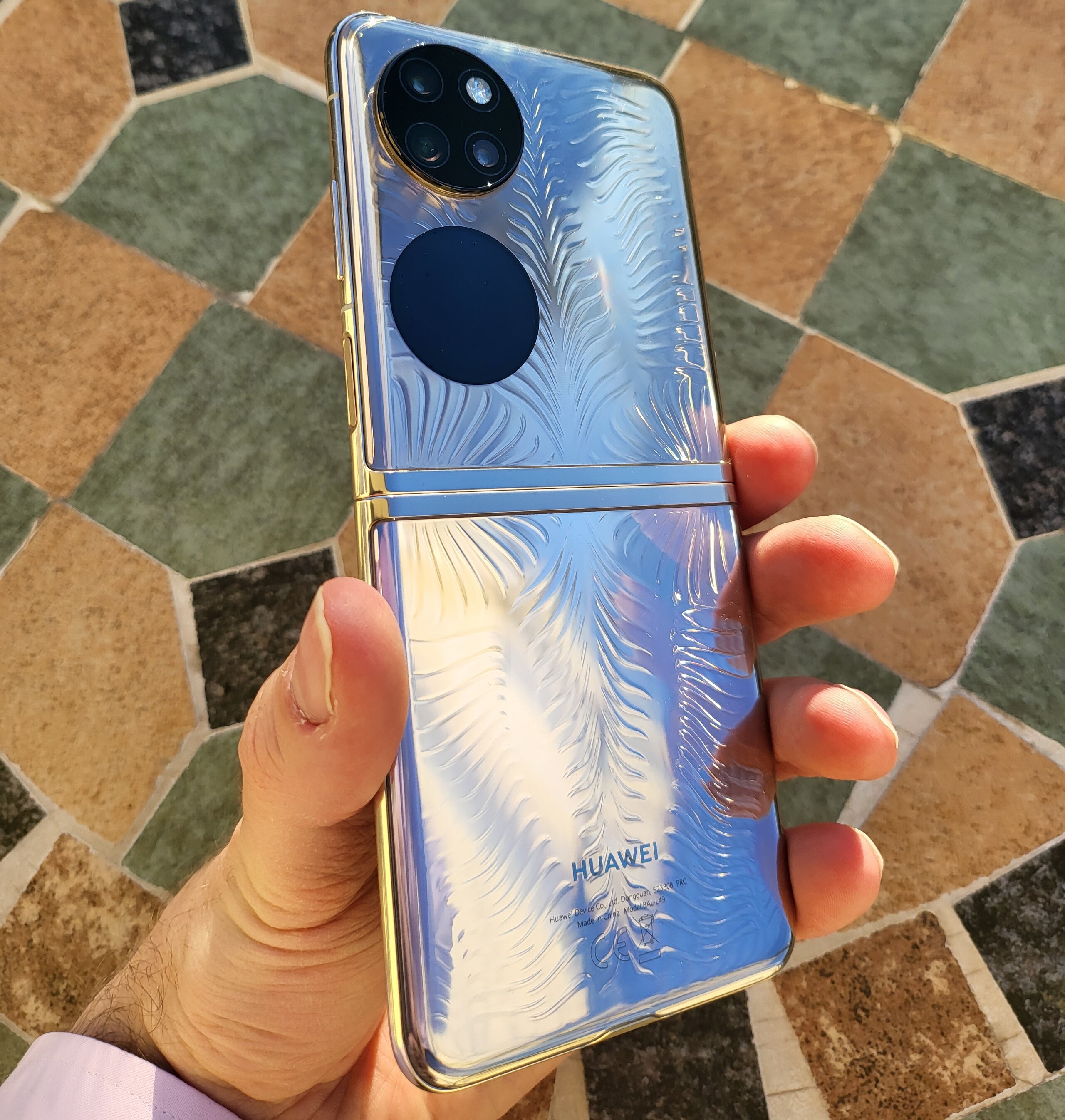 De lichte, 190 gram wegende P50 Pocket toont hoogwaardig vakmanschap. Met ongeveer 15 mm (~0,6 in) in opgevouwen toestand lijkt hij beduidend dikker dan een klassieke smartphone, maar hij is nog steeds comfortabel compact met 87 x 76 mm (~3,4 x 3 in). In tegenstelling tot deGalaxy Z Flip3heeft de P50 Pocket in gesloten toestand geen merkbare ruimte tussen de twee helften van het scherm, maar hij heeft ook geen IPX8-rating om te beschermen tegen binnendringend water.