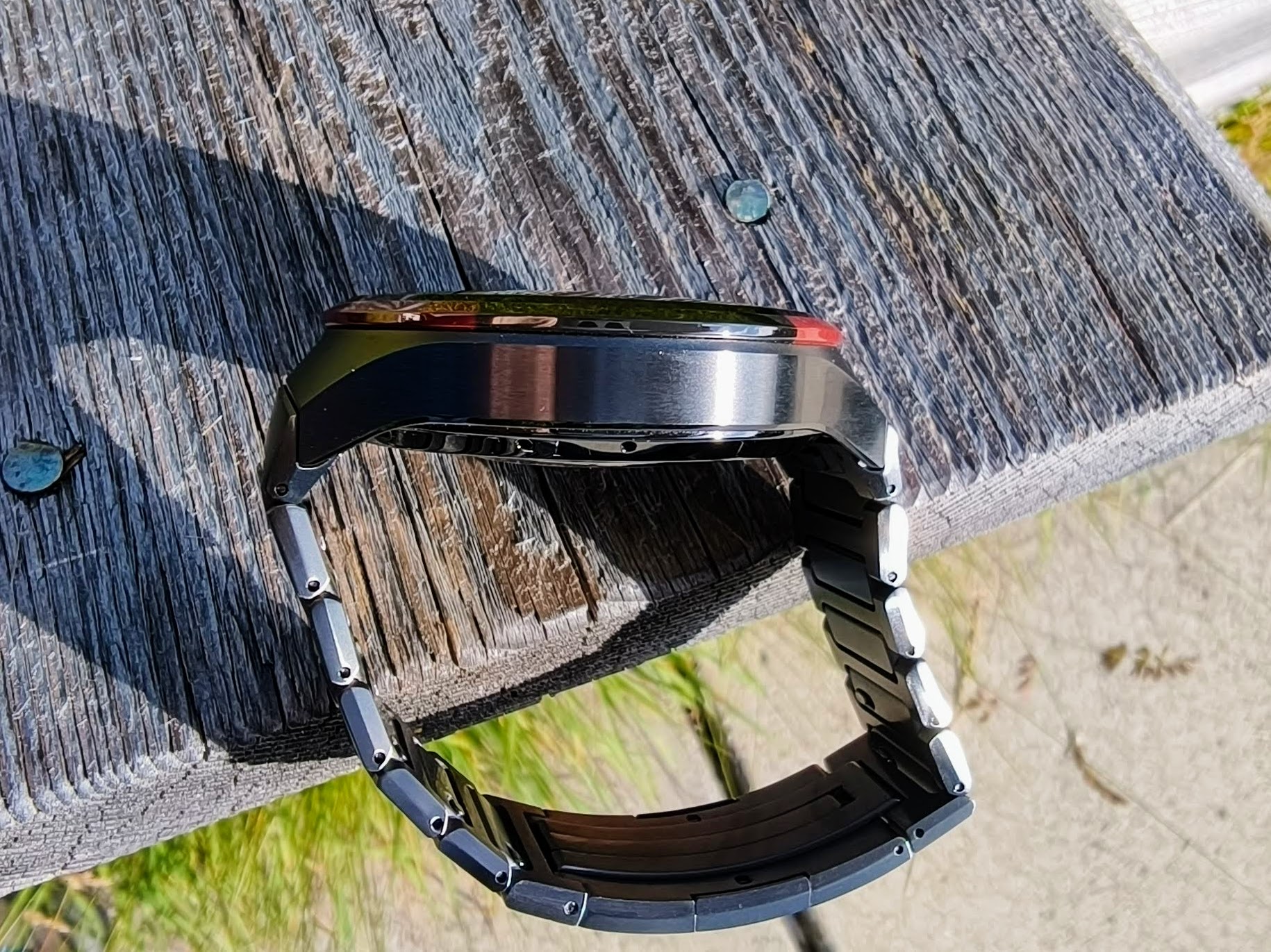 Het horloge voelt zeer hoogwaardig aan, maar met 109 gram is het ook geen lichtgewicht. De band en kast zijn mat, ze zijn van hetzelfde materiaal gemaakt en hebben dezelfde kleur. Het oppervlak is bestand tegen vingerafdrukken. Tijdens de testperiode zagen we echter wel kleine krasjes in de coating.
