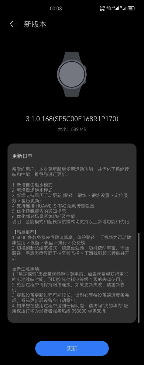 Volgens onder andere Gamingdeputy en Techgoingrolt Huawei HarmonyOS 3.1.0.168 nu uit naar de Watch 4 Pro. Gebaseerd op een automatische vertaling van de screenshot hieronder, voegt HarmonyOS 3.1.0.168 vrij duiken en speeltuinlopen toe aan de Watch 4 Pro, evenals ondersteuning voor Huawei S-TAG trainingstrackers. Zie ons artikel over de lancering voor meer details over de S-TAG en de bijbehorende functies.