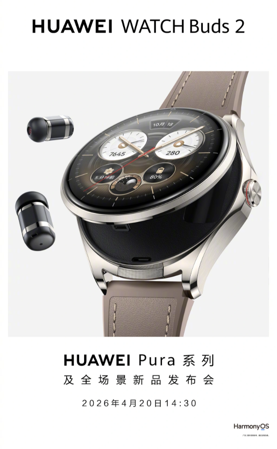Het nieuwe draagbare apparaat wordt gelanceerd als de Huawei Watch Buds 2, en zal op 20 april worden aangekondigd samen met een reeks andere producten, waaronder de Huawei Pura X Max. Huawei heeft zelfs een poster gedeeld waarop te zien is hoe de nieuwe Watch Buds 2 eruit ziet.