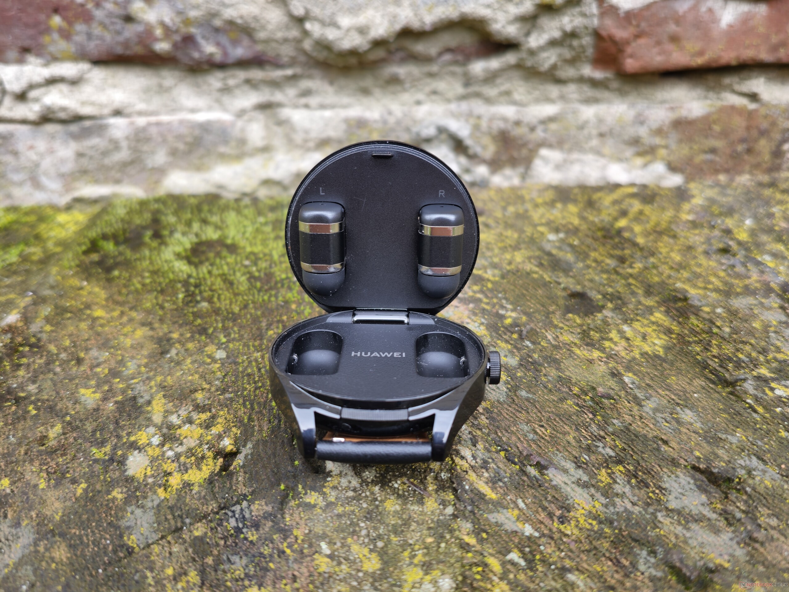 Het bijzondere aan de Huawei Watch Buds is de integratie van de True-Wireless hoofdtelefoon, die ook van invloed is op de haptiek van de smartwatch. Het zwaartepunt van het horloge ligt ongewoon hoog door het scharnierende display, waaraan de in-ear koptelefoon magnetisch is bevestigd in twee uitsparingen aan de onderkant. Zo beweegt de Huawei Watch Buds duidelijker op de pols dan andere smartwatches. Het hoge gewicht van bijna 67 gram (~2.4 oz) heeft ook een negatieve invloed.